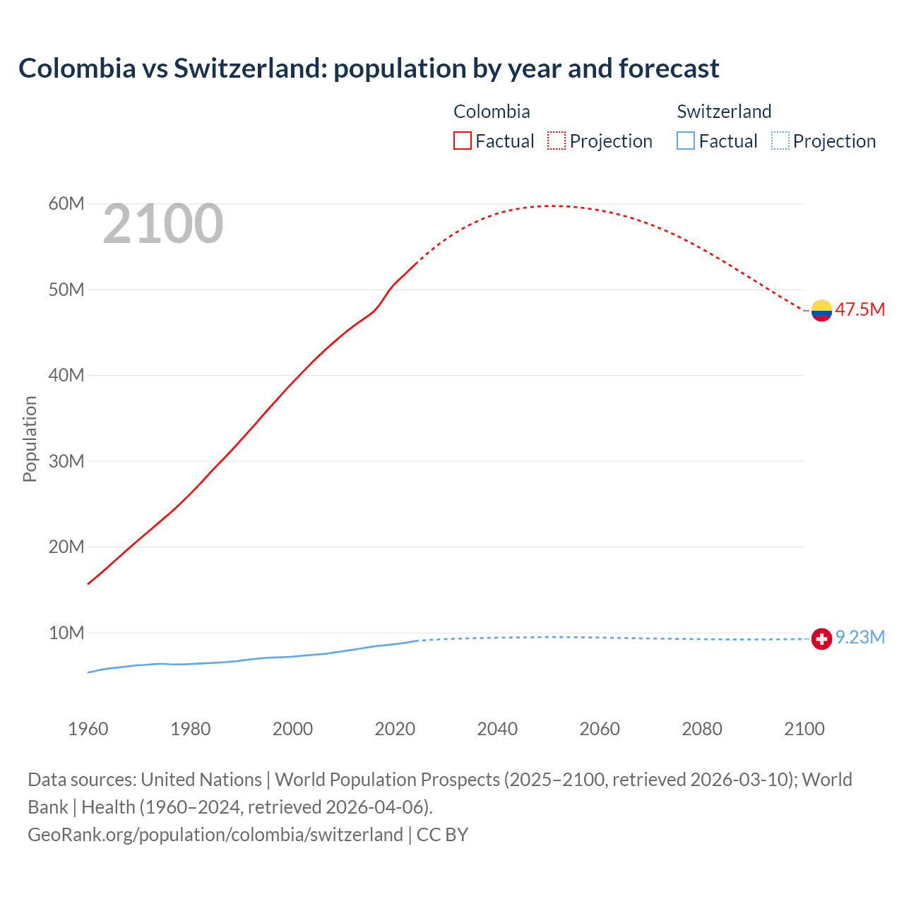 The latest officially reported population of Colombia was 52,886,363 in 2024 vs 9,005,582 people in Switzerland in 2024. In 2026, based on the adjusted UN estimation, the current Colombia's population is 54,105,437 people compared to 9,107,866 in Switzerland.