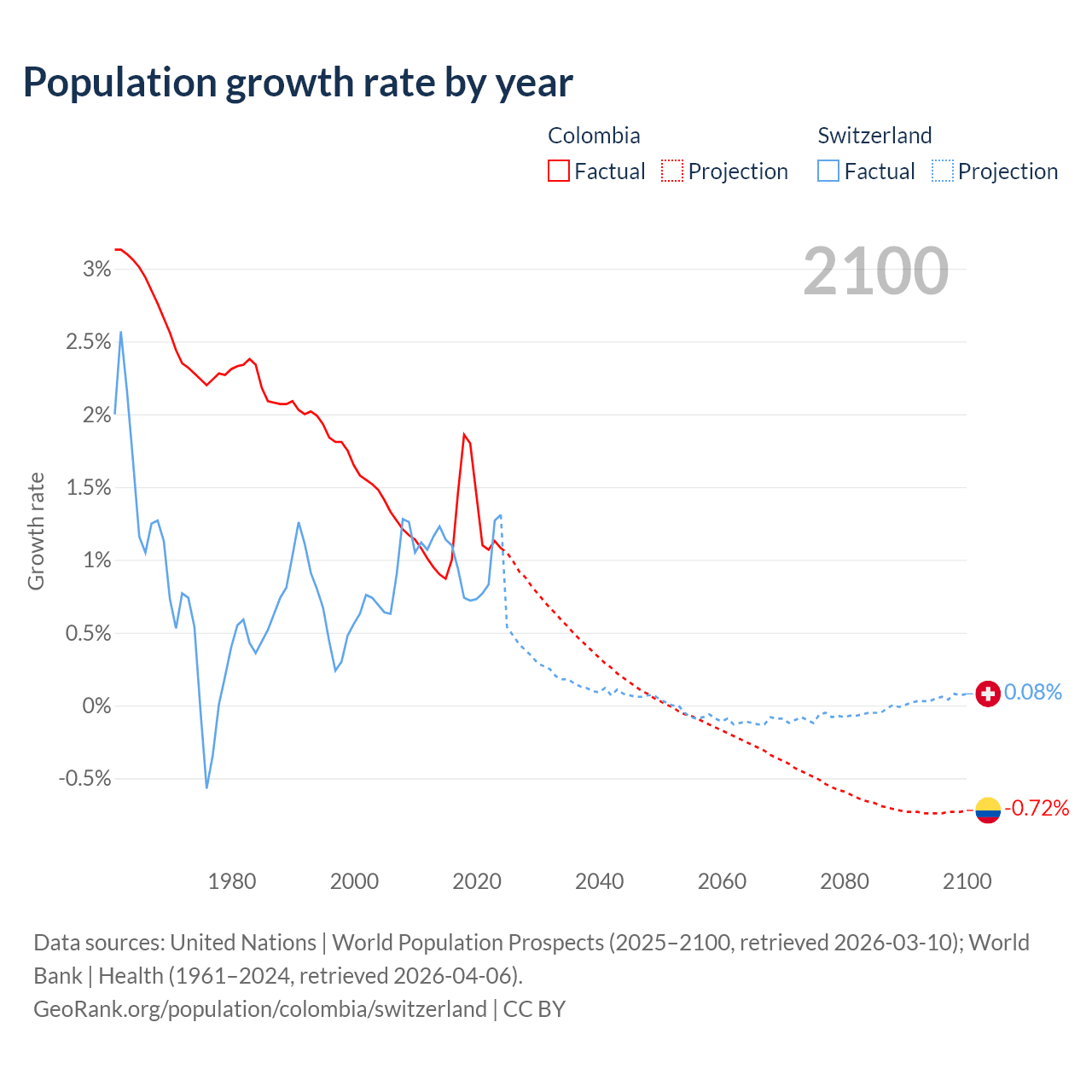 - For the last 10 years, Colombia has had an average growth rate of +1.25% per year vs +0.98% in Switzerland.