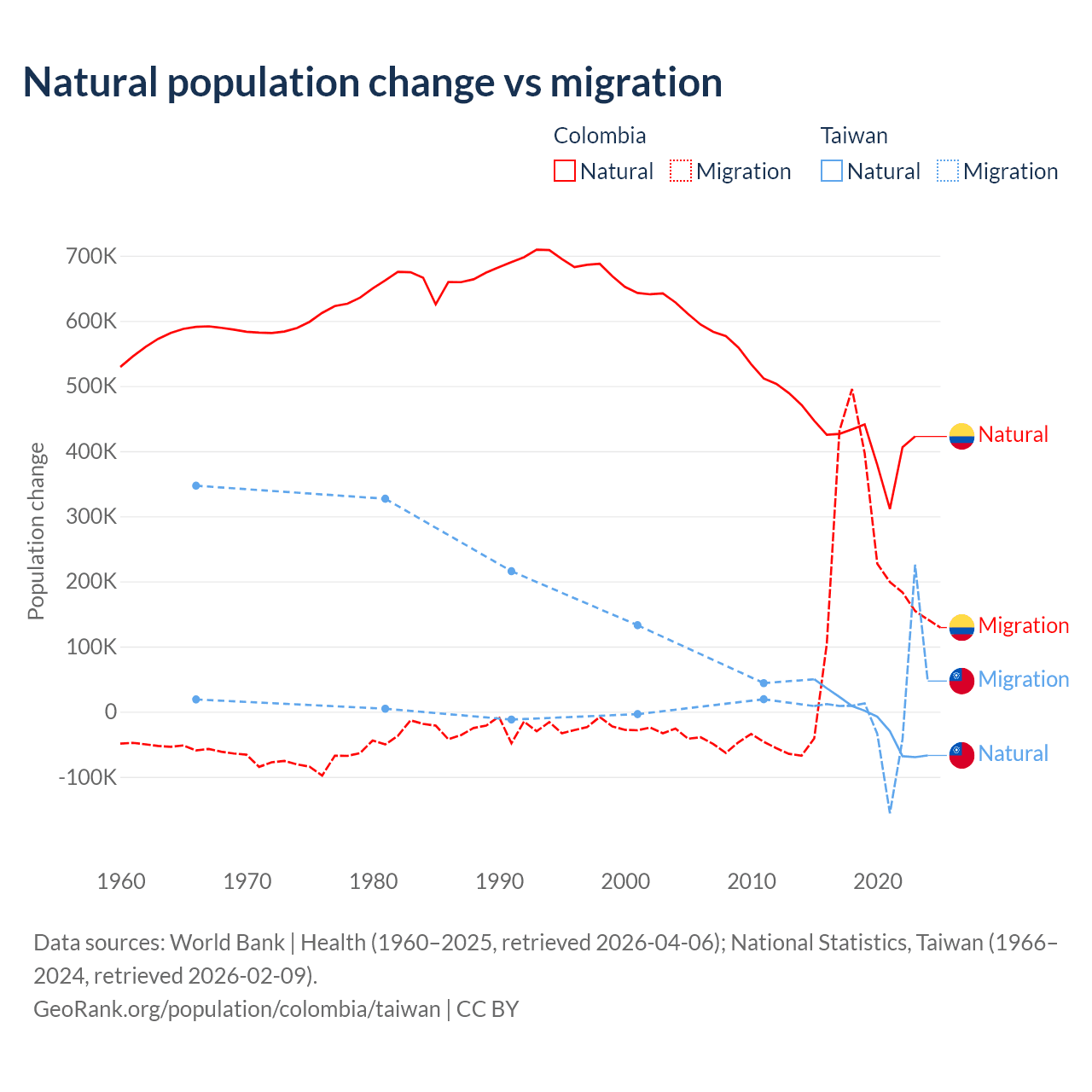 Over the last 10 years, 66.6% of the population change in Colombia is from natural causes (a gain of 4,162,856 people) and 33.4% is from migration (a gain of 2,083,051 people). In Taiwan 56.7% is from natural causes (a loss of 57,467 people) and 43.3% is from migration (a gain of 43,884 people).