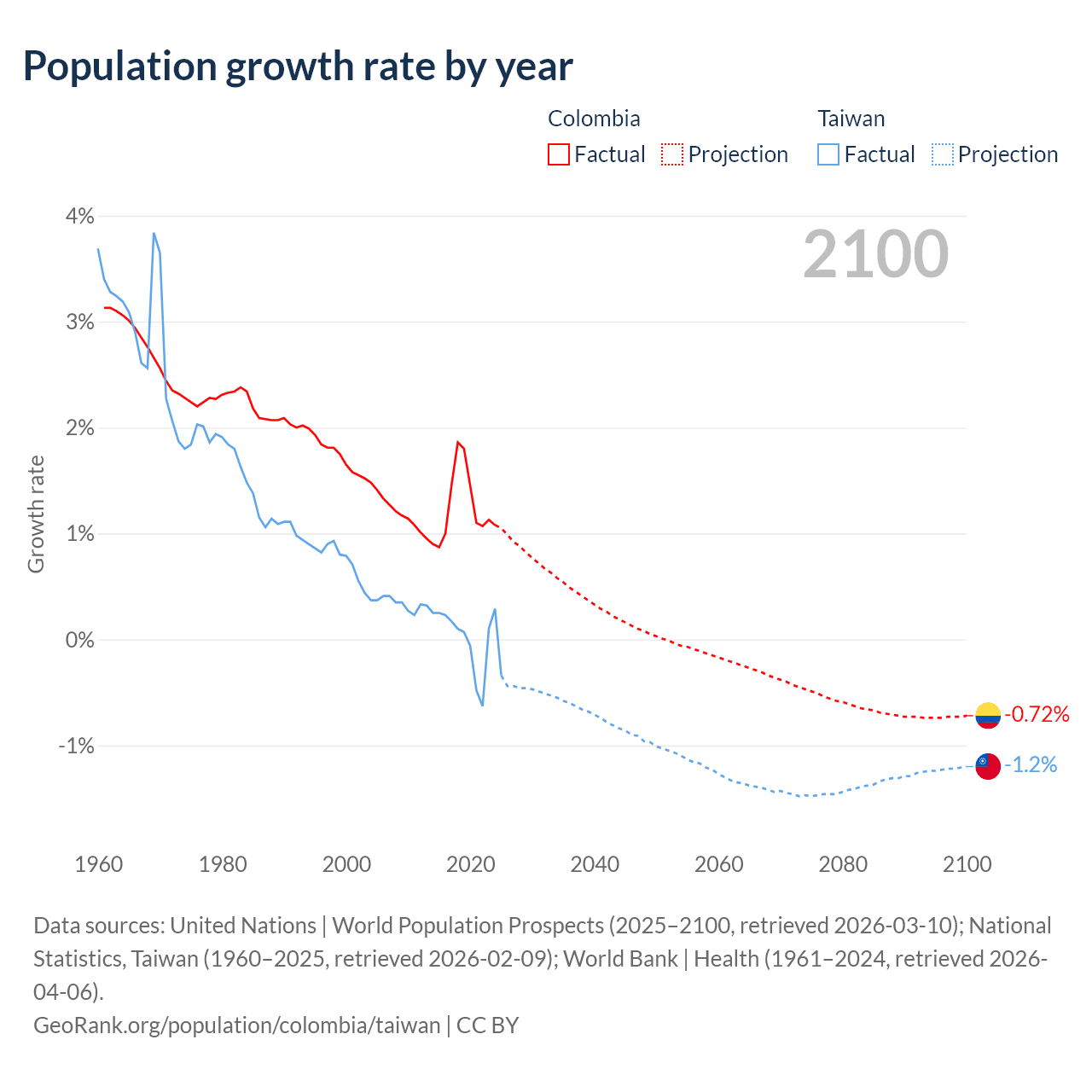 - For the last 10 years, Colombia has had an average growth rate of +1.25% per year vs -0.03% in Taiwan.
