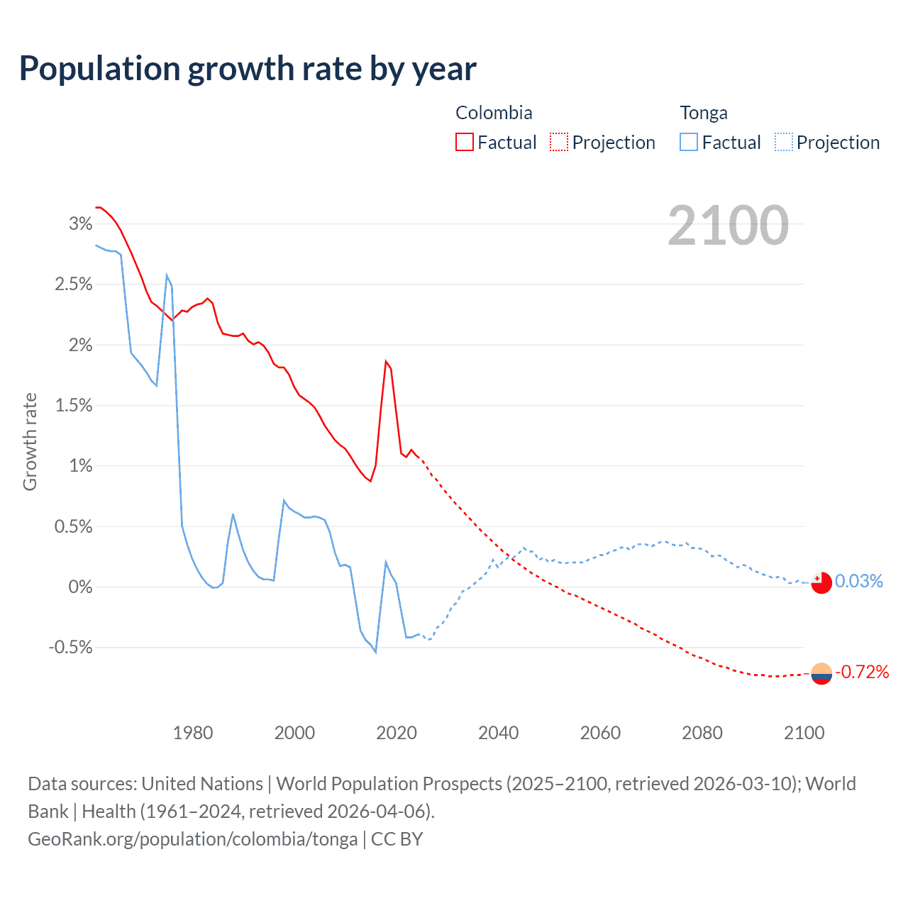 - For the last 10 years, Colombia has had an average growth rate of +1.25% per year vs -0.25% in Tonga.