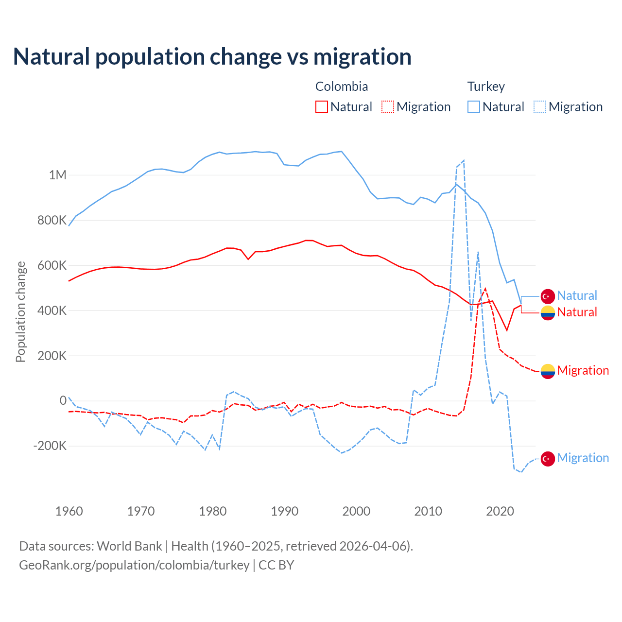 Over the last 10 years, 66.6% of the population change in Colombia is from natural causes (a gain of 4,162,856 people) and 33.4% is from migration (a gain of 2,083,051 people). In Turkey 73% is from natural causes (a gain of 7,333,352 people) and 27% is from migration (a gain of 2,718,916 people).