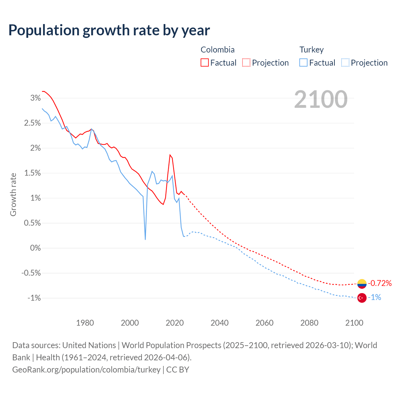 - For the last 10 years, Colombia has had an average growth rate of +1.25% per year vs +1.06% in Turkey.