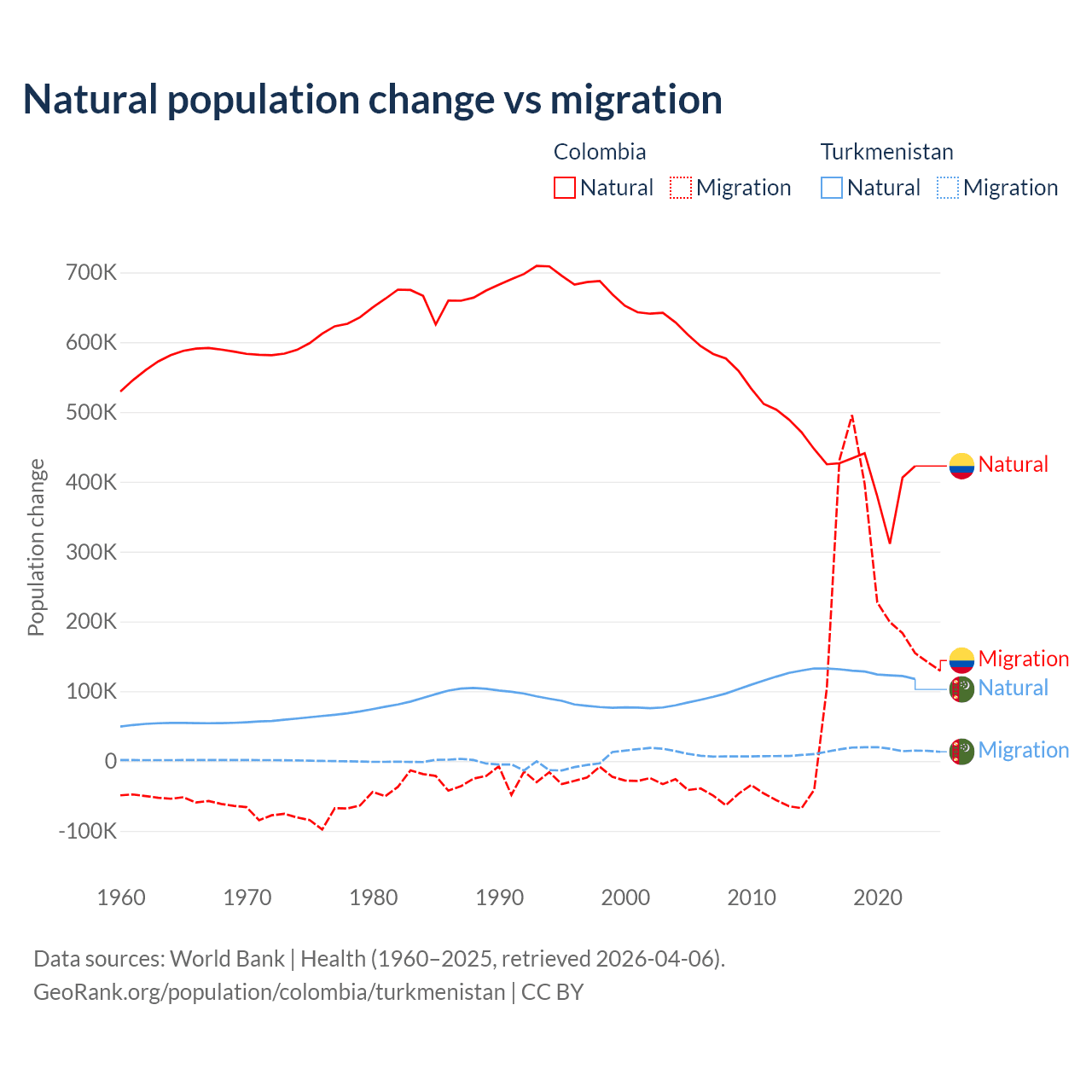 Over the last 10 years, 66.6% of the population change in Colombia is from natural causes (a gain of 4,162,856 people) and 33.4% is from migration (a gain of 2,083,051 people). In Turkmenistan 89.2% is from natural causes (a gain of 1,270,228 people) and 10.8% is from migration (a gain of 154,379 people).