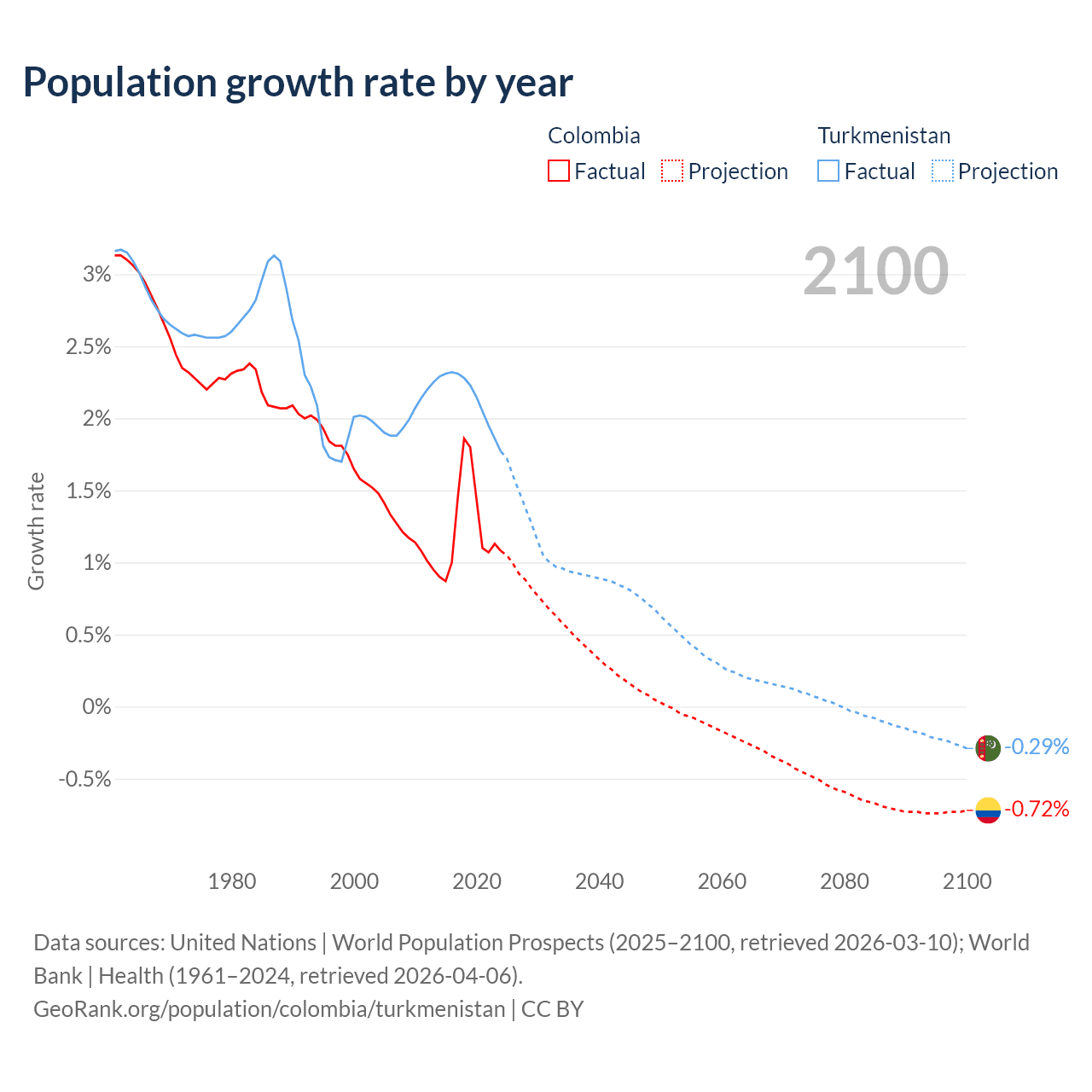 - For the last 10 years, Colombia has had an average growth rate of +1.25% per year vs +2.14% in Turkmenistan.