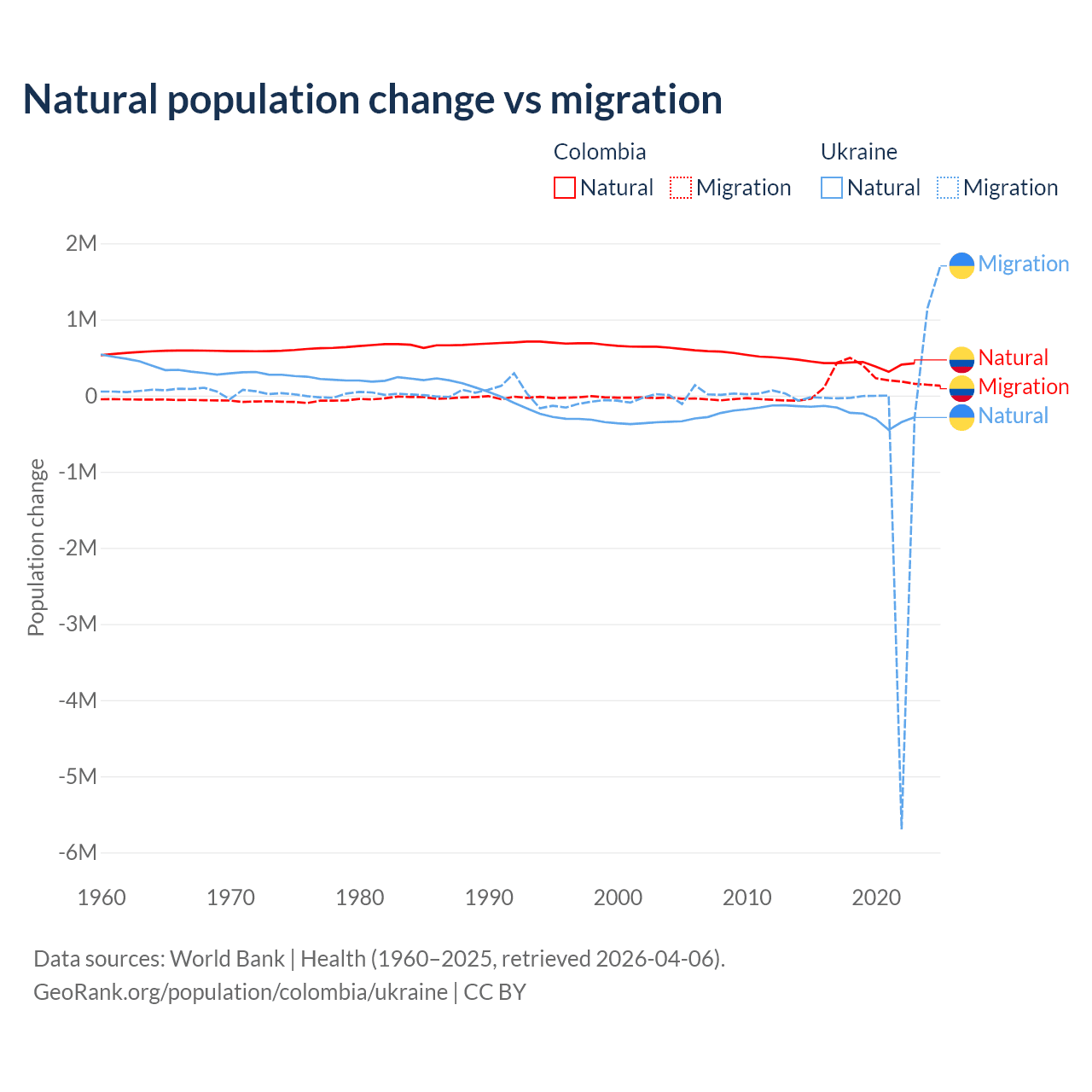 Over the last 10 years, 66.6% of the population change in Colombia is from natural causes (a gain of 4,162,856 people) and 33.4% is from migration (a gain of 2,083,051 people). In Ukraine 28.2% is from natural causes (a loss of 2,435,153 people) and 71.8% is from migration (a loss of 6,198,995 people).