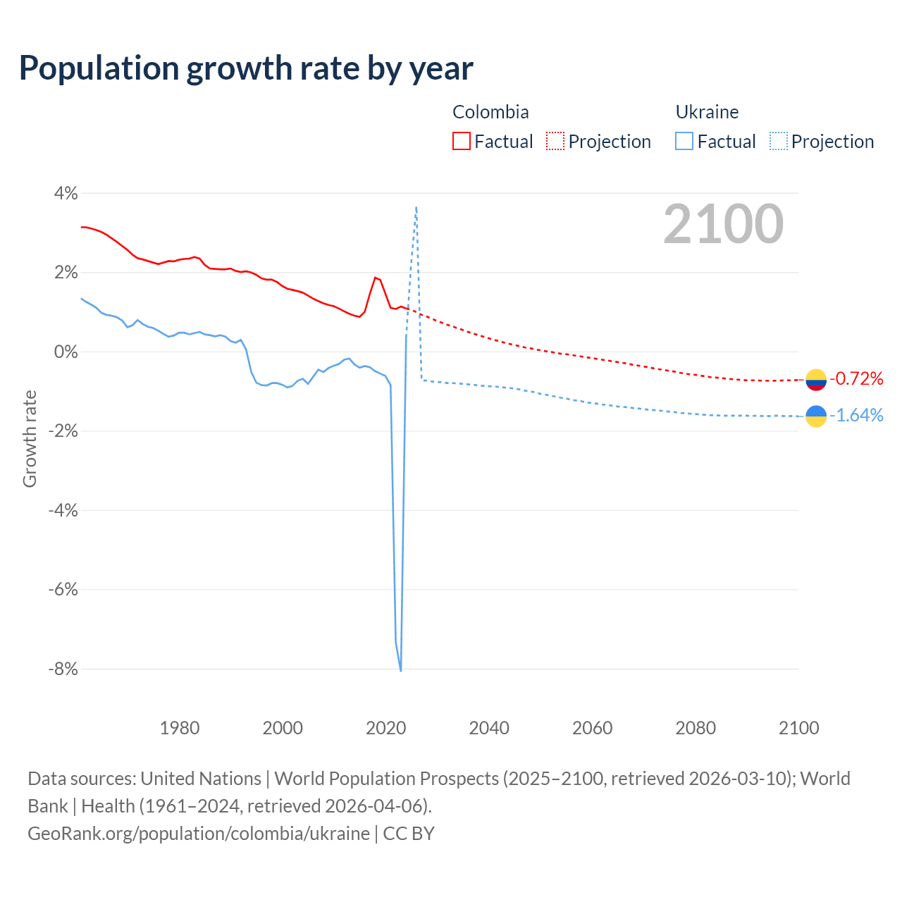 - For the last 10 years, Colombia has had an average growth rate of +1.25% per year vs -1.74% in Ukraine.