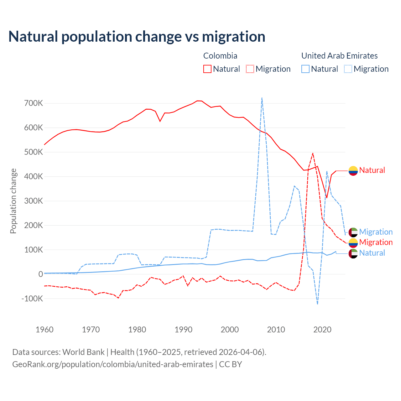 Over the last 10 years, 66.6% of the population change in Colombia is from natural causes (a gain of 4,162,856 people) and 33.4% is from migration (a gain of 2,083,051 people). In the United Arab Emirates 30.5% is from natural causes (a gain of 857,996 people) and 69.5% is from migration (a gain of 1,958,520 people).