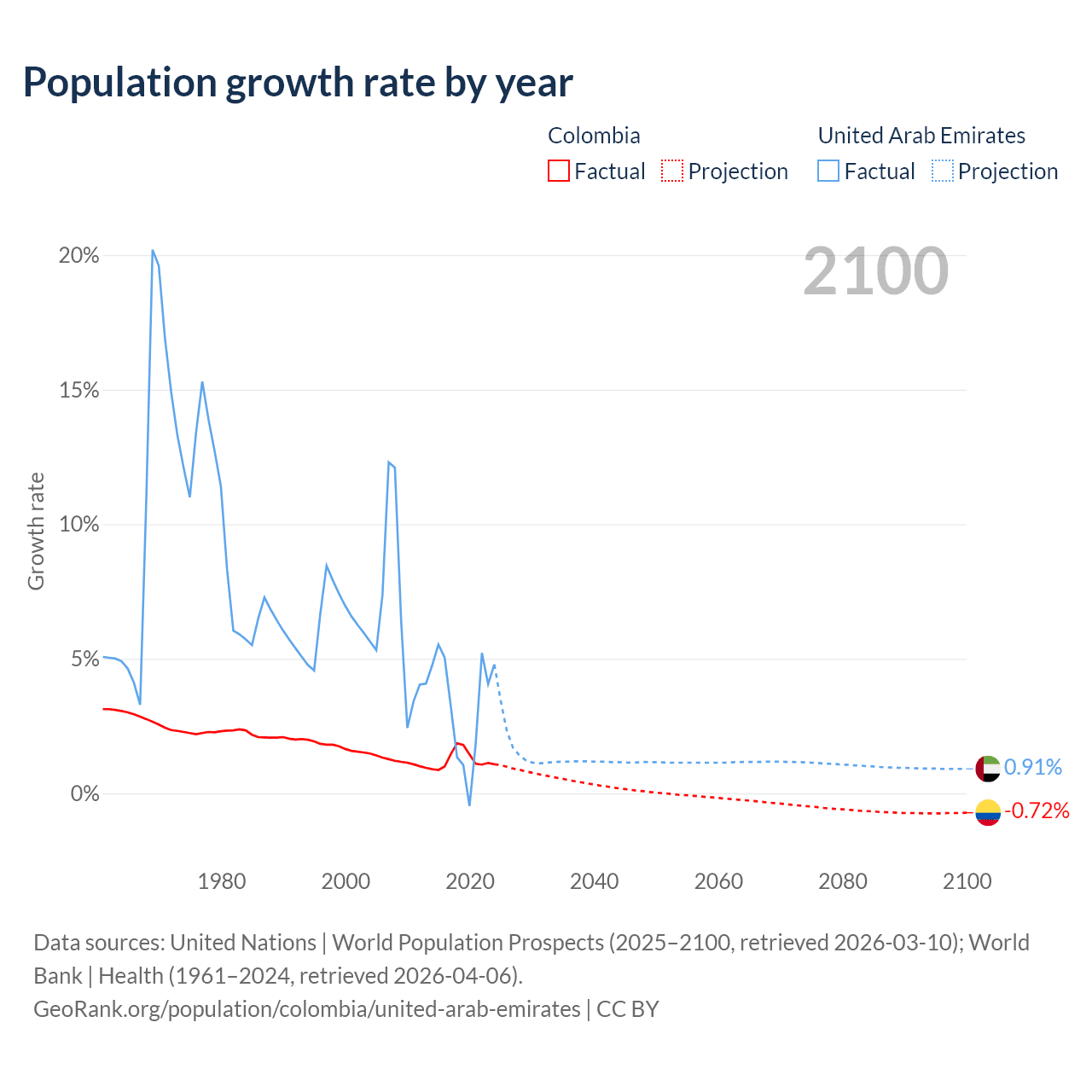 - For the last 10 years, Colombia has had an average growth rate of +1.25% per year vs +3.31% in the United Arab Emirates.