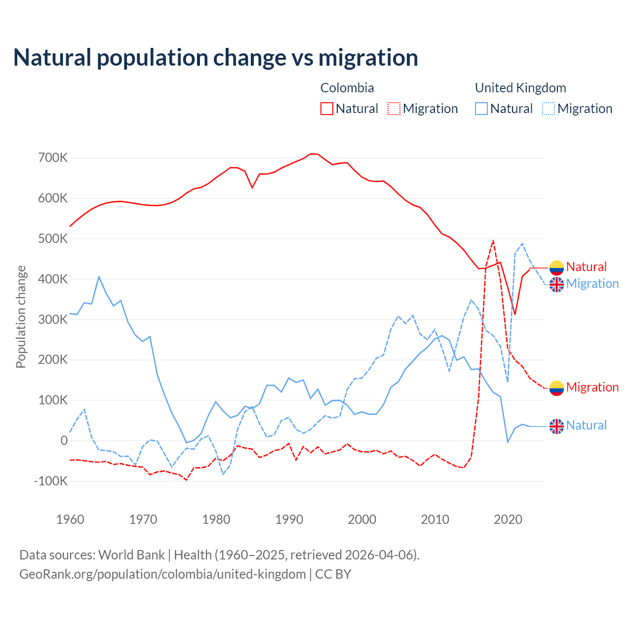Over the last 10 years, 66.6% of the population change in Colombia is from natural causes (a gain of 4,162,856 people) and 33.4% is from migration (a gain of 2,083,051 people). In the United Kingdom 23.9% is from natural causes (a gain of 1,033,129 people) and 76.1% is from migration (a gain of 3,283,101 people).