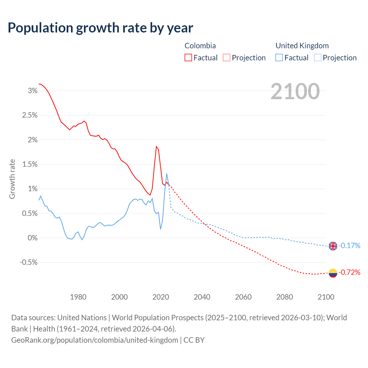- For the last 10 years, Colombia has had an average growth rate of +1.25% per year vs +0.7% in the United Kingdom.