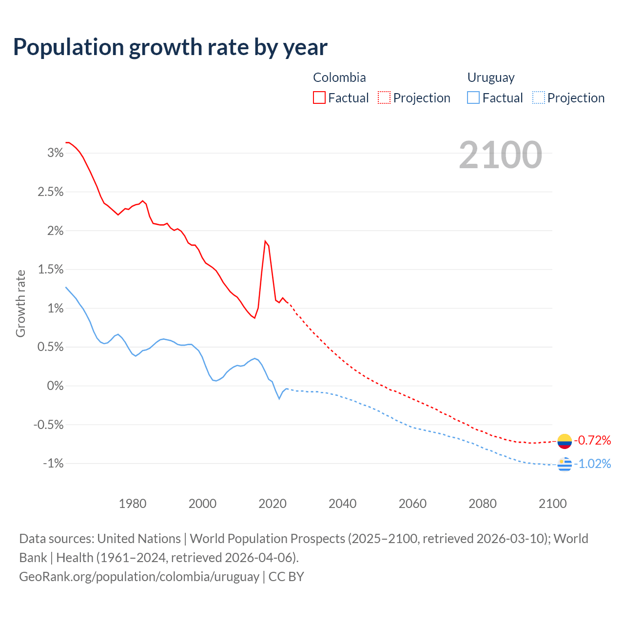 - For the last 10 years, Colombia has had an average growth rate of +1.25% per year vs +0.11% in Uruguay.