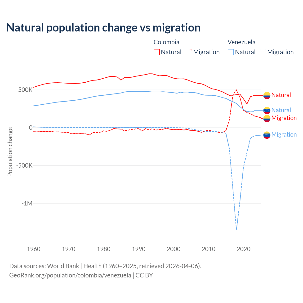 Over the last 10 years, 66.6% of the population change in Colombia is from natural causes (a gain of 4,162,856 people) and 33.4% is from migration (a gain of 2,083,051 people). In Venezuela 38.6% is from natural causes (a gain of 2,946,257 people) and 61.4% is from migration (a loss of 4,683,227 people).