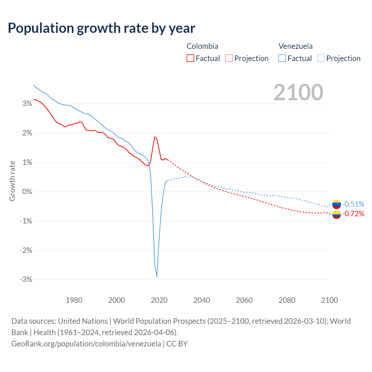 - For the last 10 years, Colombia has had an average growth rate of +1.25% per year vs -0.46% in Venezuela.