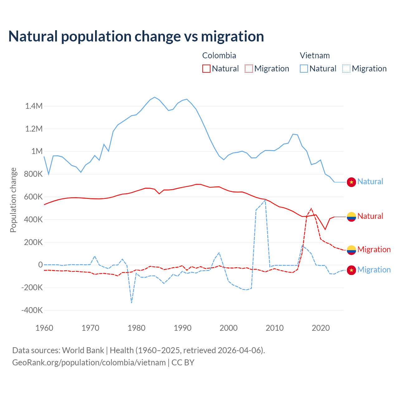 Over the last 10 years, 66.6% of the population change in Colombia is from natural causes (a gain of 4,162,856 people) and 33.4% is from migration (a gain of 2,083,051 people). In Vietnam 97.7% is from natural causes (a gain of 9,349,756 people) and 2.29% is from migration (a gain of 219,073 people).