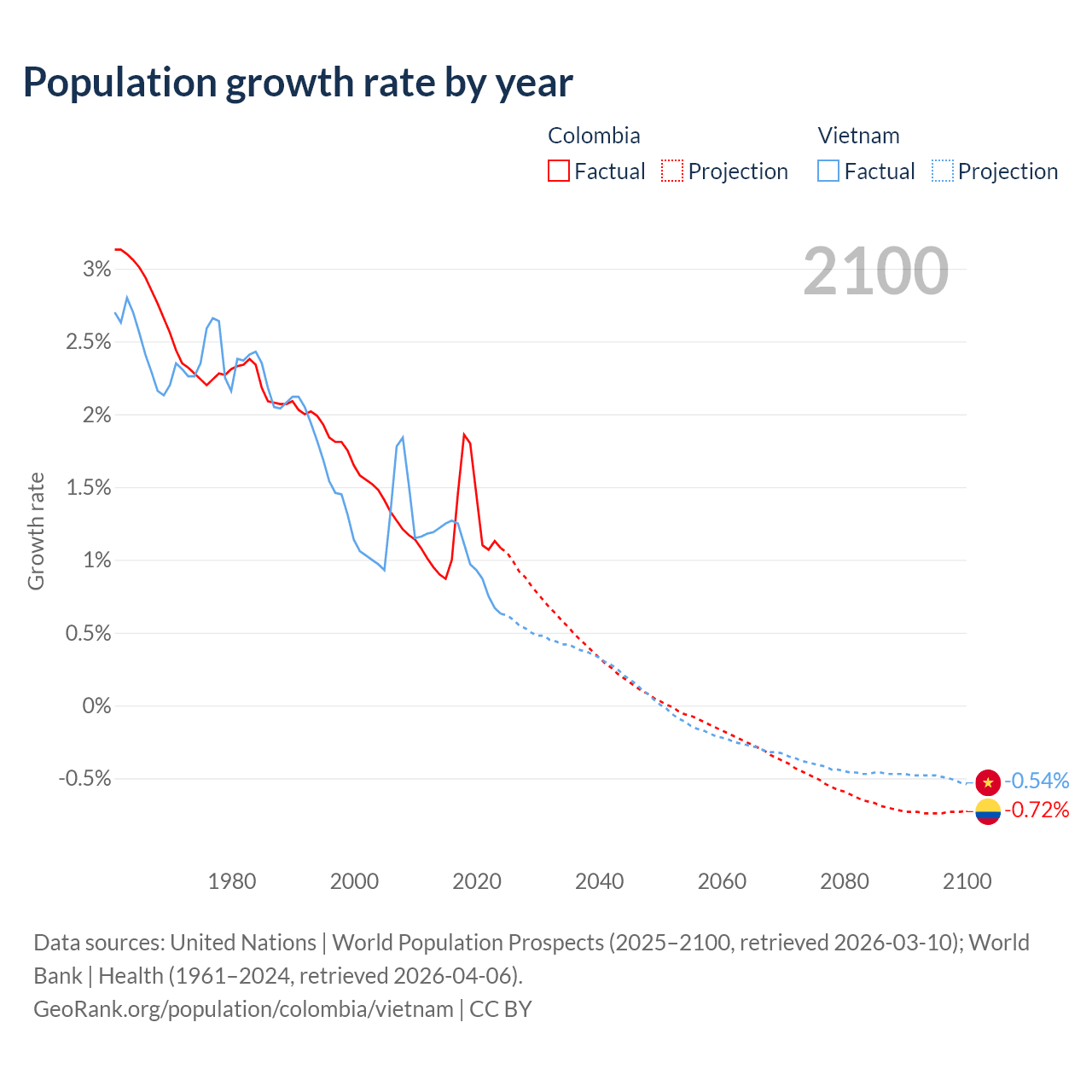 - For the last 10 years, Colombia has had an average growth rate of +1.25% per year vs +0.99% in Vietnam.