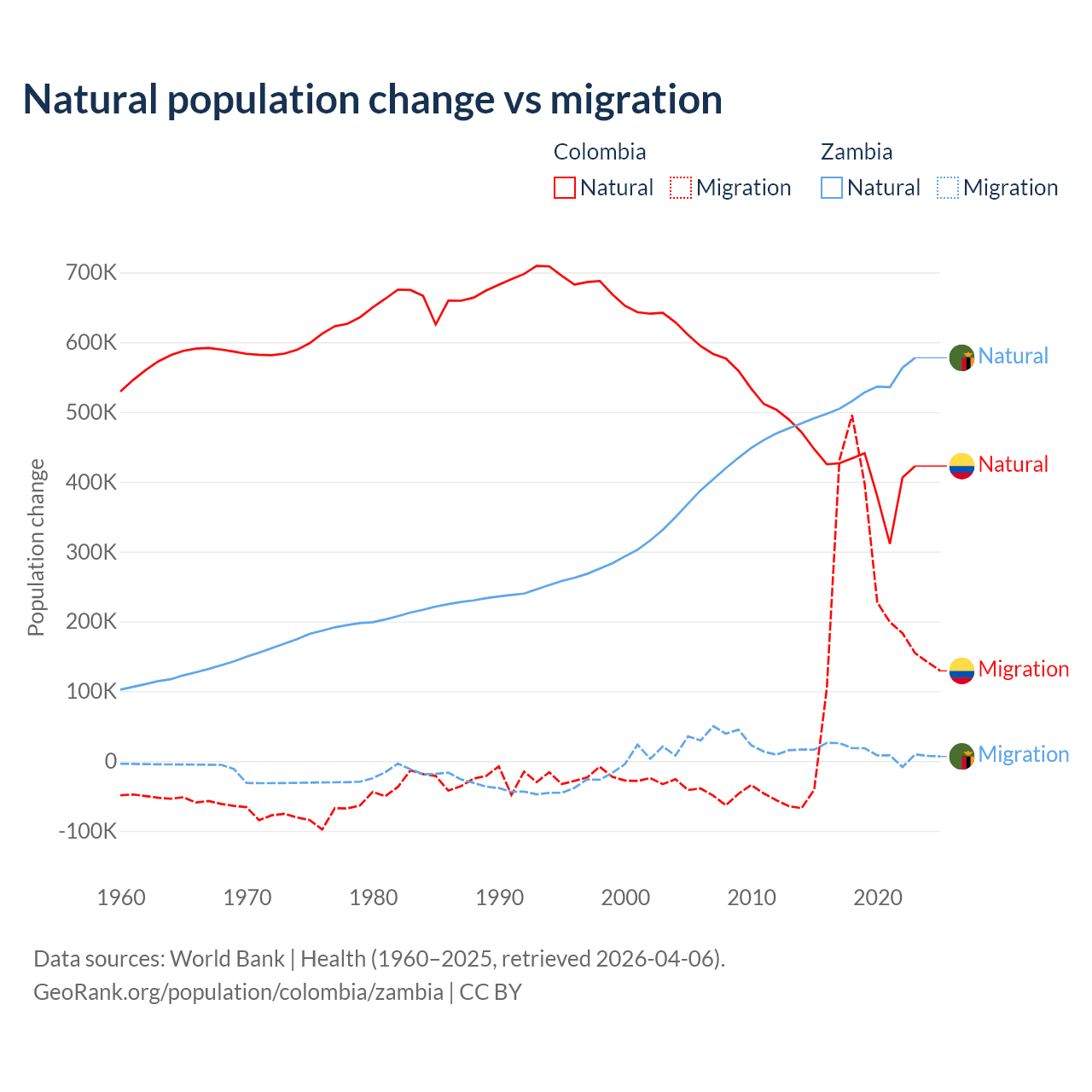 Over the last 10 years, 66.6% of the population change in Colombia is from natural causes (a gain of 4,162,856 people) and 33.4% is from migration (a gain of 2,083,051 people). In Zambia 97.4% is from natural causes (a gain of 5,233,797 people) and 2.58% is from migration (a gain of 138,554 people).