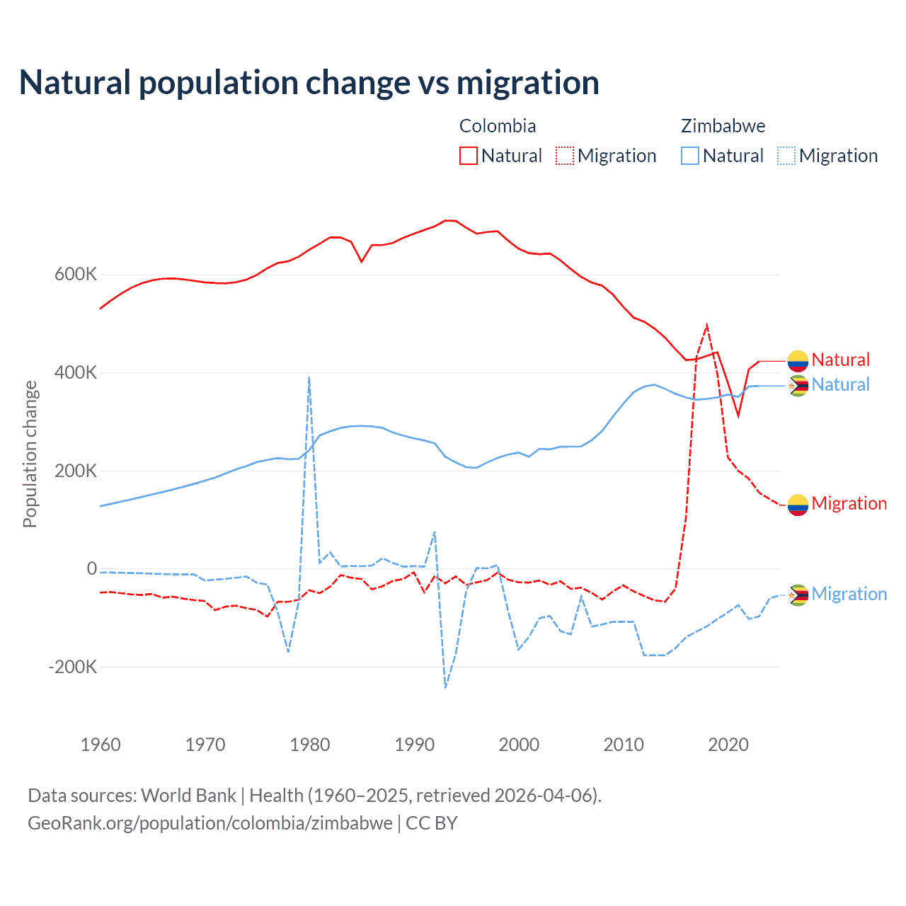 Over the last 10 years, 66.6% of the population change in Colombia is from natural causes (a gain of 4,162,856 people) and 33.4% is from migration (a gain of 2,083,051 people). In Zimbabwe 74.9% is from natural causes (a gain of 3,558,487 people) and 25.1% is from migration (a loss of 1,192,807 people).