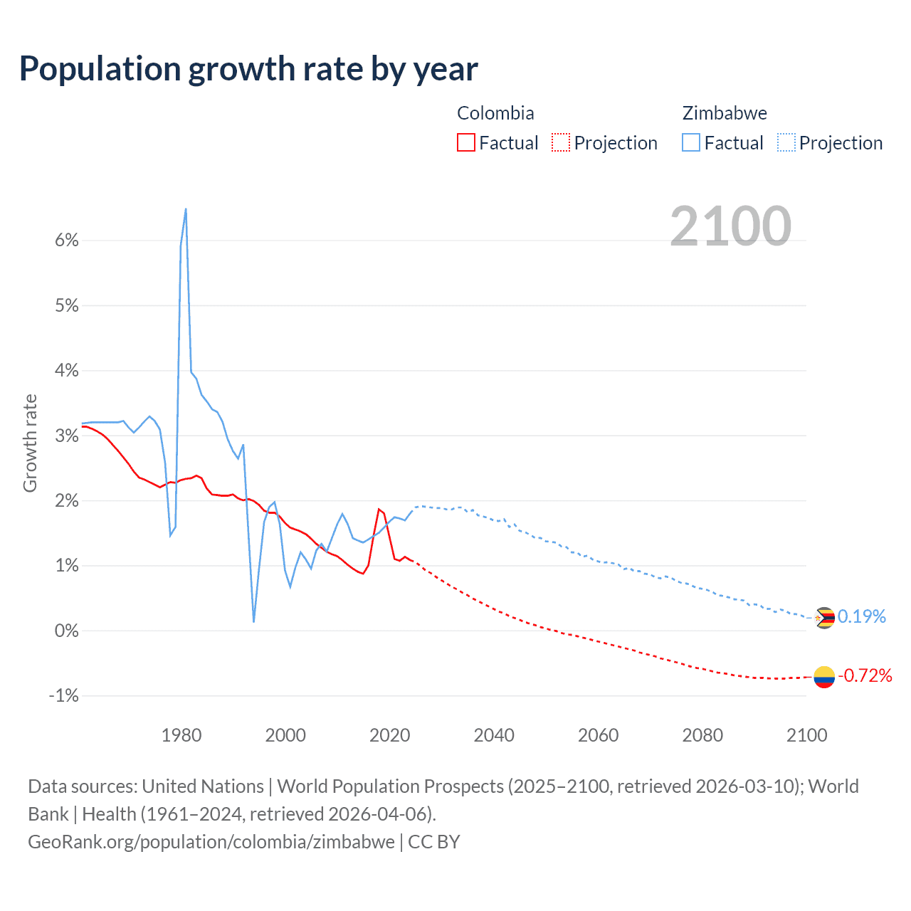 - For the last 10 years, Colombia has had an average growth rate of +1.25% per year vs +1.57% in Zimbabwe.