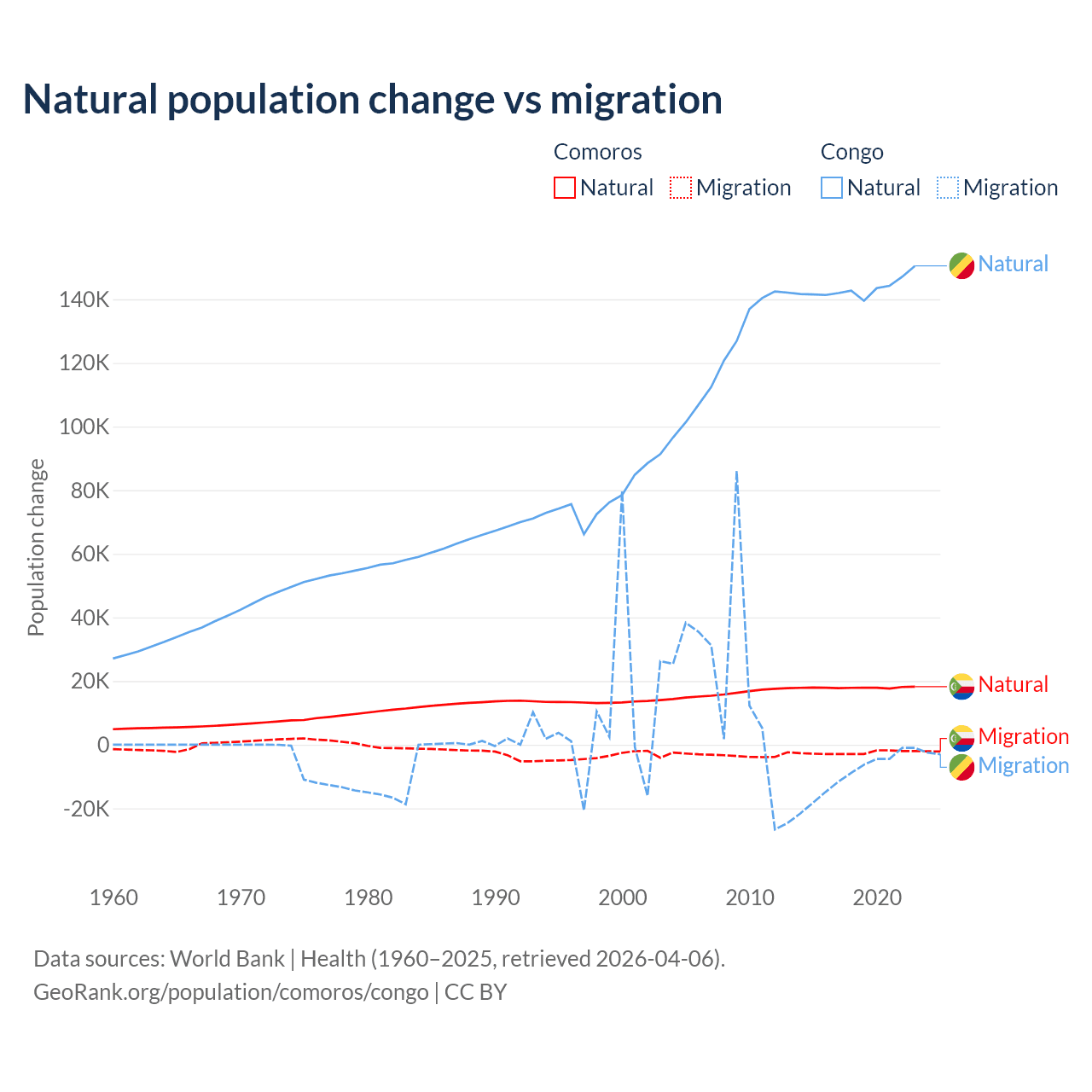 Over the last 10 years, 87.9% of the population change in Comoros is from natural causes (a gain of 179,319 people) and 12.1% is from migration (a loss of 24,709 people). In the Congo 94% is from natural causes (a gain of 1,434,056 people) and 6.04% is from migration (a loss of 92,251 people).