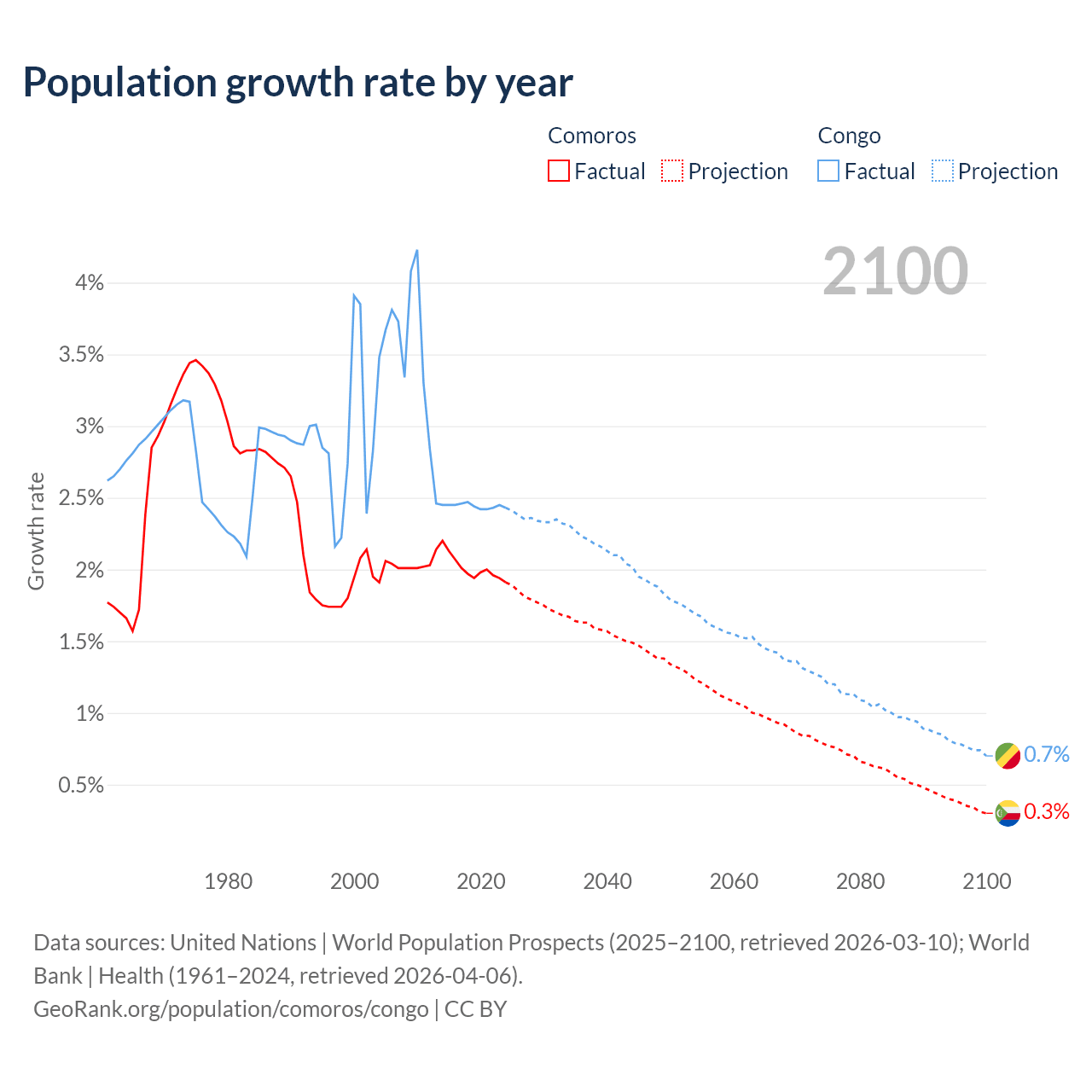 - For the last 10 years, Comoros has had an average growth rate of +2.01% per year vs +2.44% in the Congo.