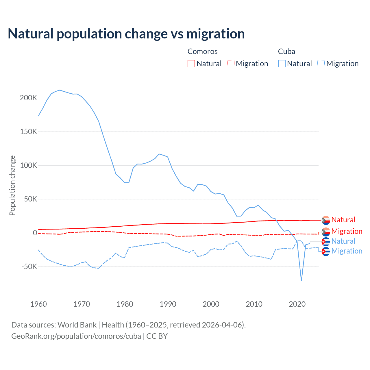 Over the last 10 years, 87.9% of the population change in Comoros is from natural causes (a gain of 179,319 people) and 12.1% is from migration (a loss of 24,709 people). In Cuba 21.9% is from natural causes (a loss of 64,179 people) and 78.1% is from migration (a loss of 229,508 people).