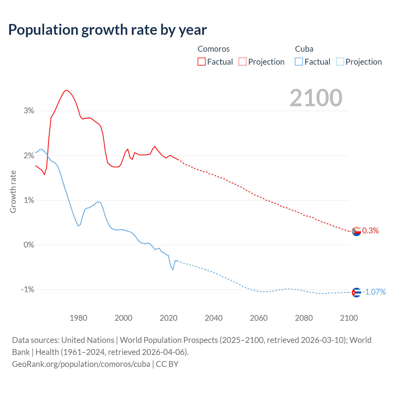 - For the last 10 years, Comoros has had an average growth rate of +2.01% per year vs -0.26% in Cuba.