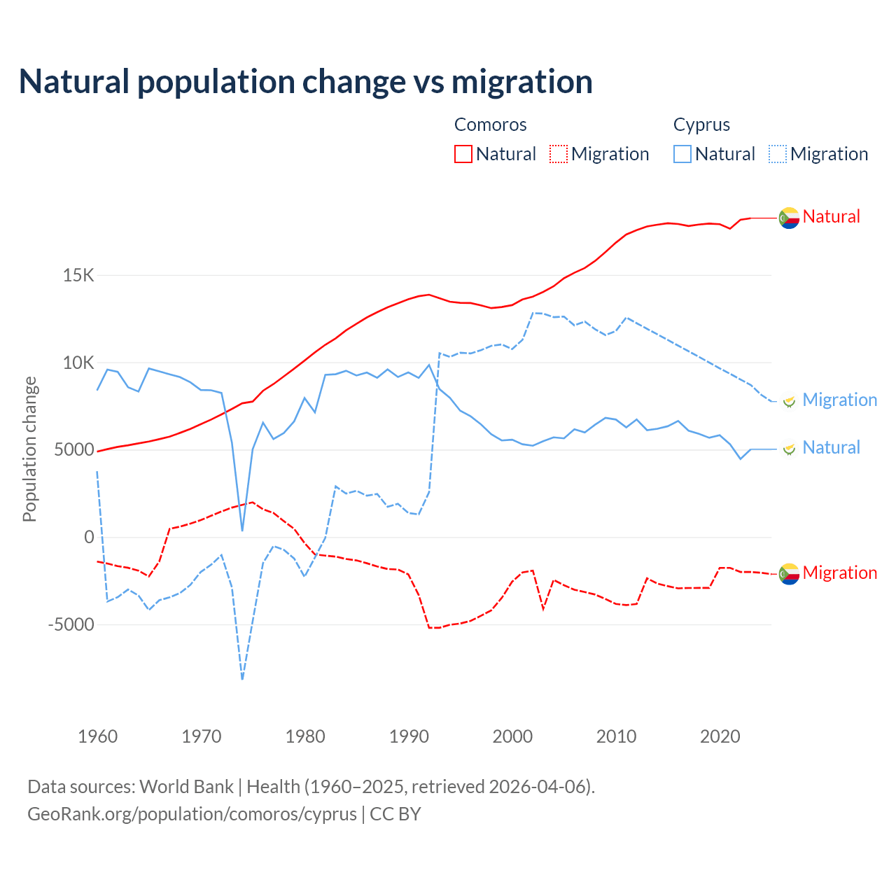 Over the last 10 years, 87.9% of the population change in Comoros is from natural causes (a gain of 179,319 people) and 12.1% is from migration (a loss of 24,709 people). In Cyprus 36.2% is from natural causes (a gain of 57,464 people) and 63.8% is from migration (a gain of 101,458 people).