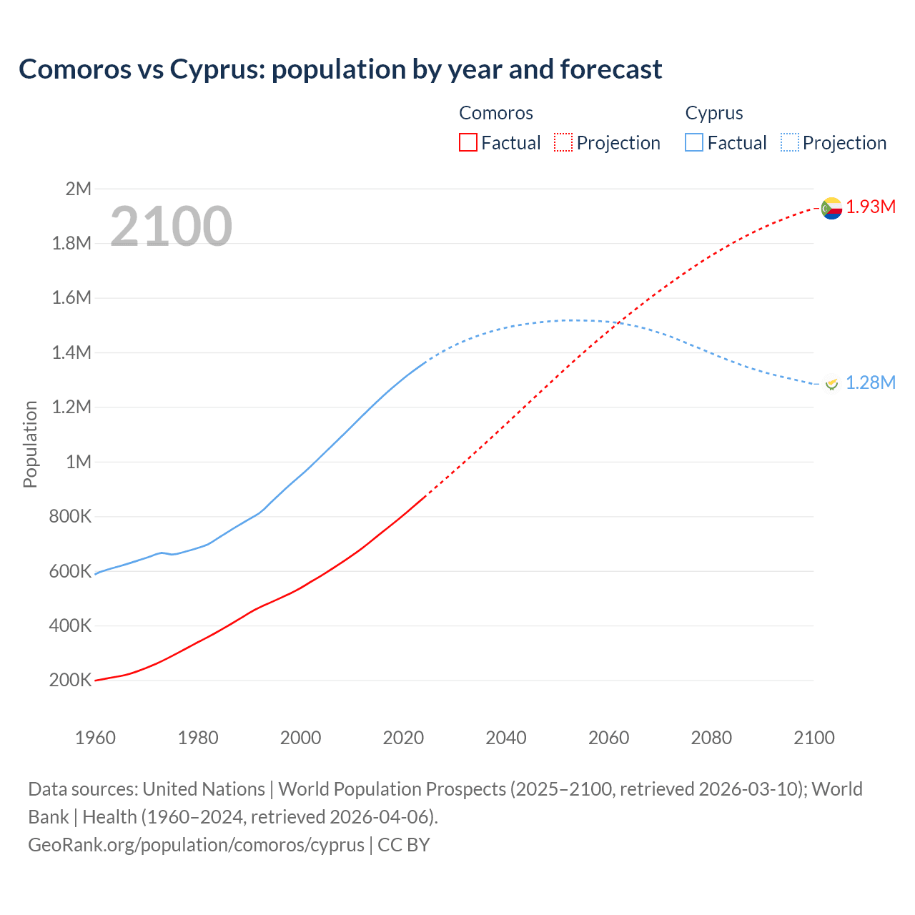 The latest officially reported population of Comoros was 866,628 in 2024 vs 1,358,282 people in Cyprus in 2024. In 2026, based on the adjusted UN estimation, the current Comoros' population is 903,776 people compared to 1,386,362 in Cyprus.