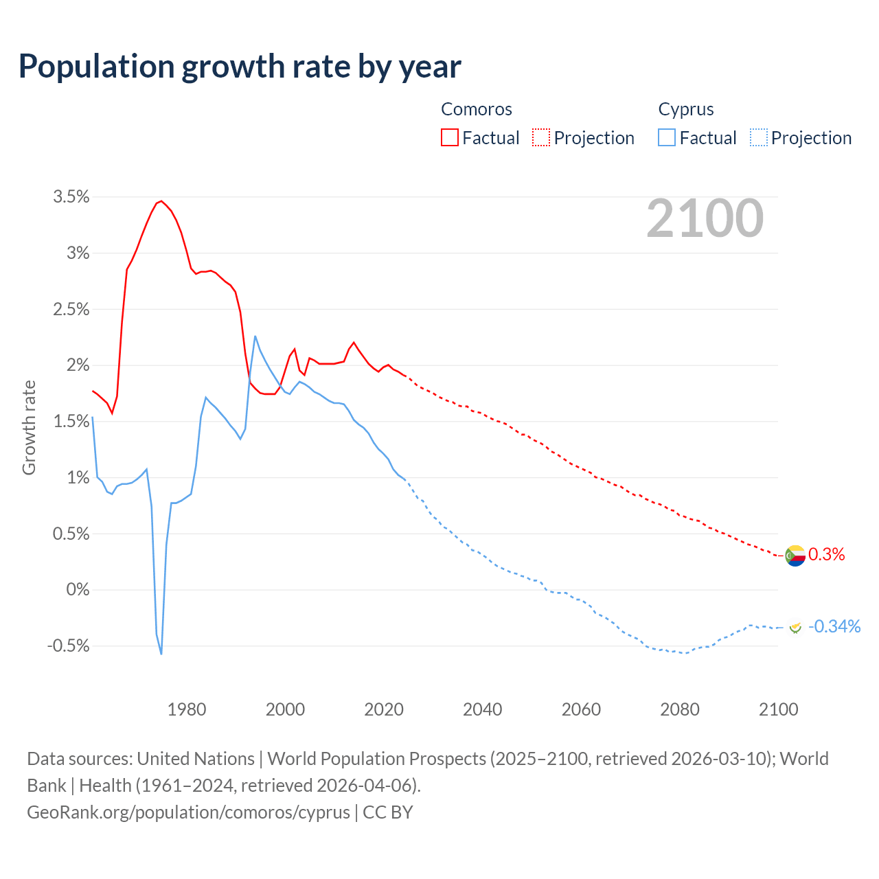 - For the last 10 years, Comoros has had an average growth rate of +2.01% per year vs +1.26% in Cyprus.
