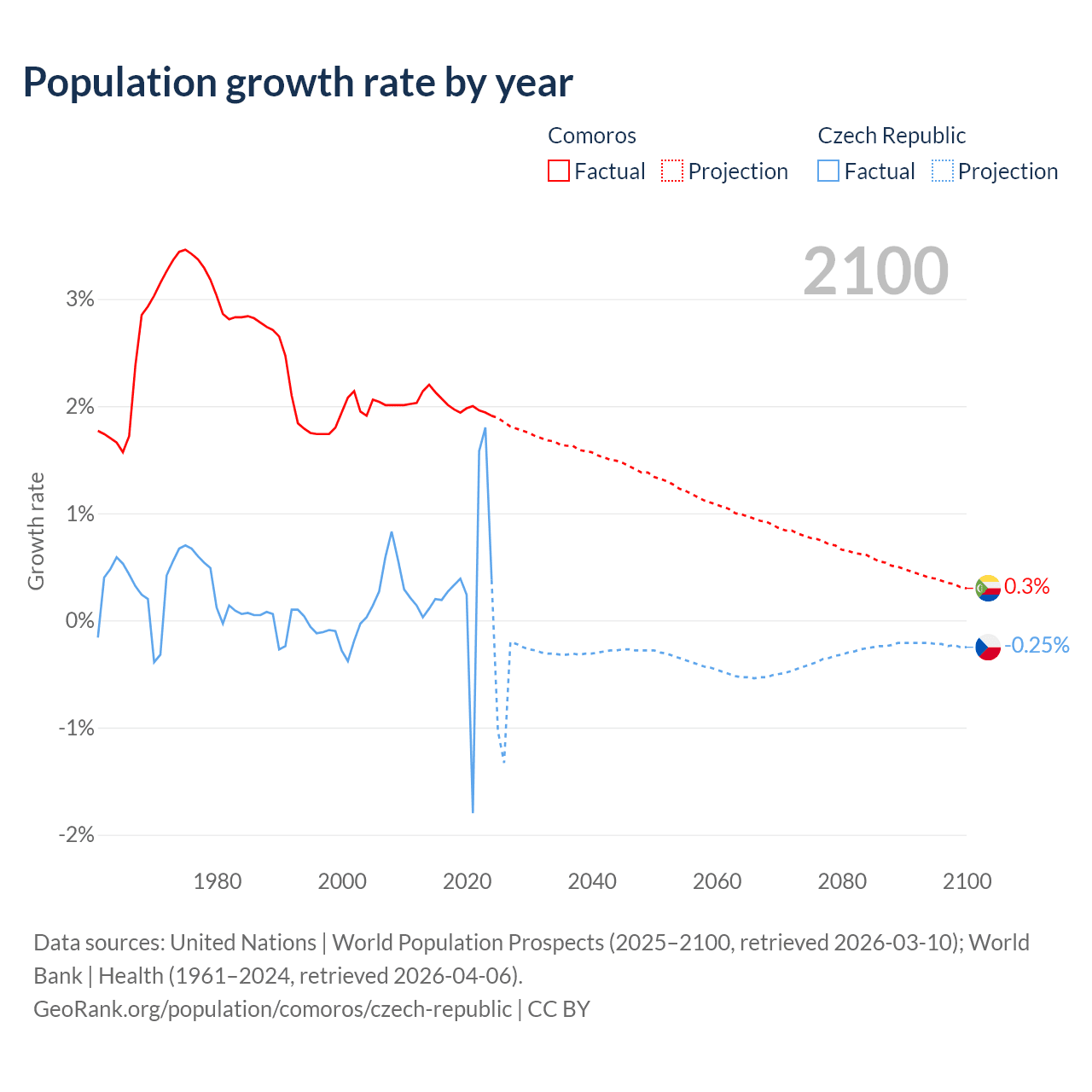 - For the last 10 years, Comoros has had an average growth rate of +2.01% per year vs +0.34% in the Czech Republic.