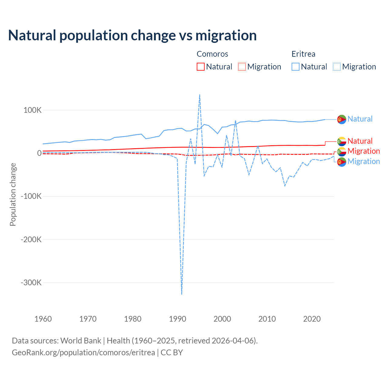 Over the last 10 years, 87.9% of the population change in Comoros is from natural causes (a gain of 179,319 people) and 12.1% is from migration (a loss of 24,709 people). In Eritrea 68.8% is from natural causes (a gain of 742,837 people) and 31.2% is from migration (a loss of 336,243 people).