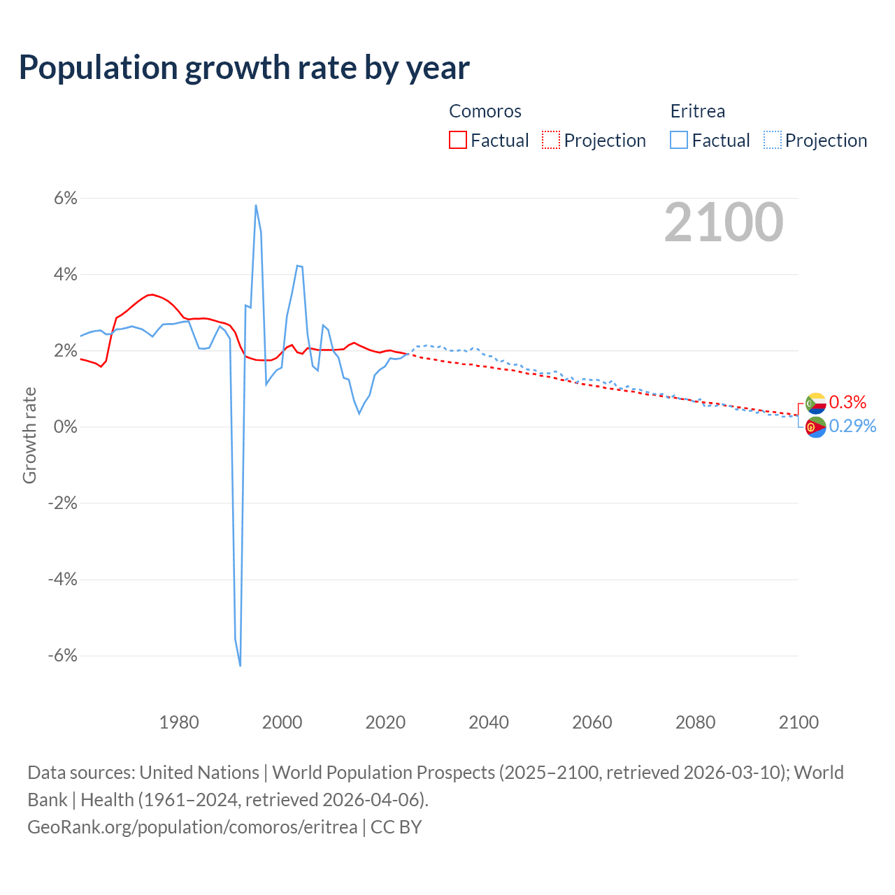 - For the last 10 years, Comoros has had an average growth rate of +2.01% per year vs +1.28% in Eritrea.