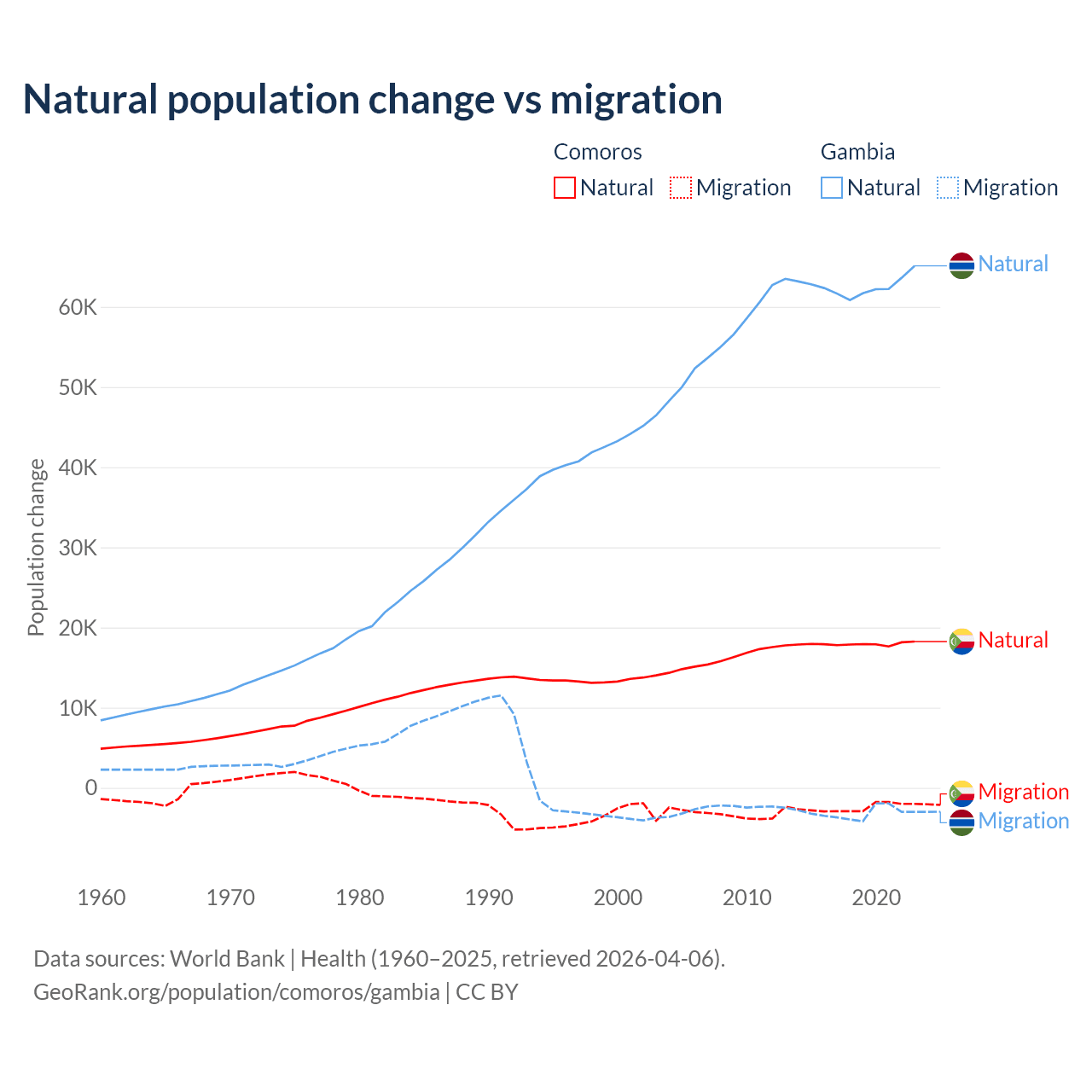Over the last 10 years, 87.9% of the population change in Comoros is from natural causes (a gain of 179,319 people) and 12.1% is from migration (a loss of 24,709 people). In the Gambia 95.2% is from natural causes (a gain of 625,795 people) and 4.75% is from migration (a loss of 31,227 people).
