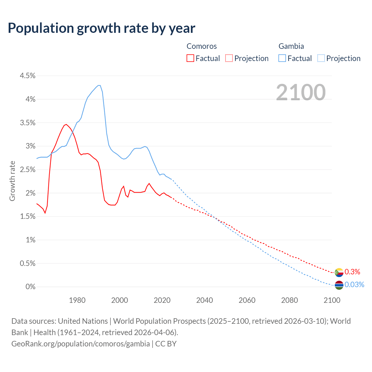 - For the last 10 years, Comoros has had an average growth rate of +2.01% per year vs +2.5% in the Gambia.