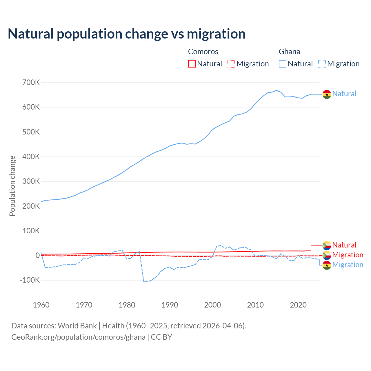 Over the last 10 years, 87.9% of the population change in Comoros is from natural causes (a gain of 179,319 people) and 12.1% is from migration (a loss of 24,709 people). In Ghana 98.6% is from natural causes (a gain of 6,484,449 people) and 1.37% is from migration (a loss of 90,310 people).