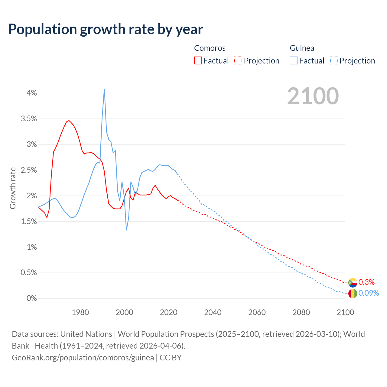 - For the last 10 years, Comoros has had an average growth rate of +2.01% per year vs +2.54% in Guinea.