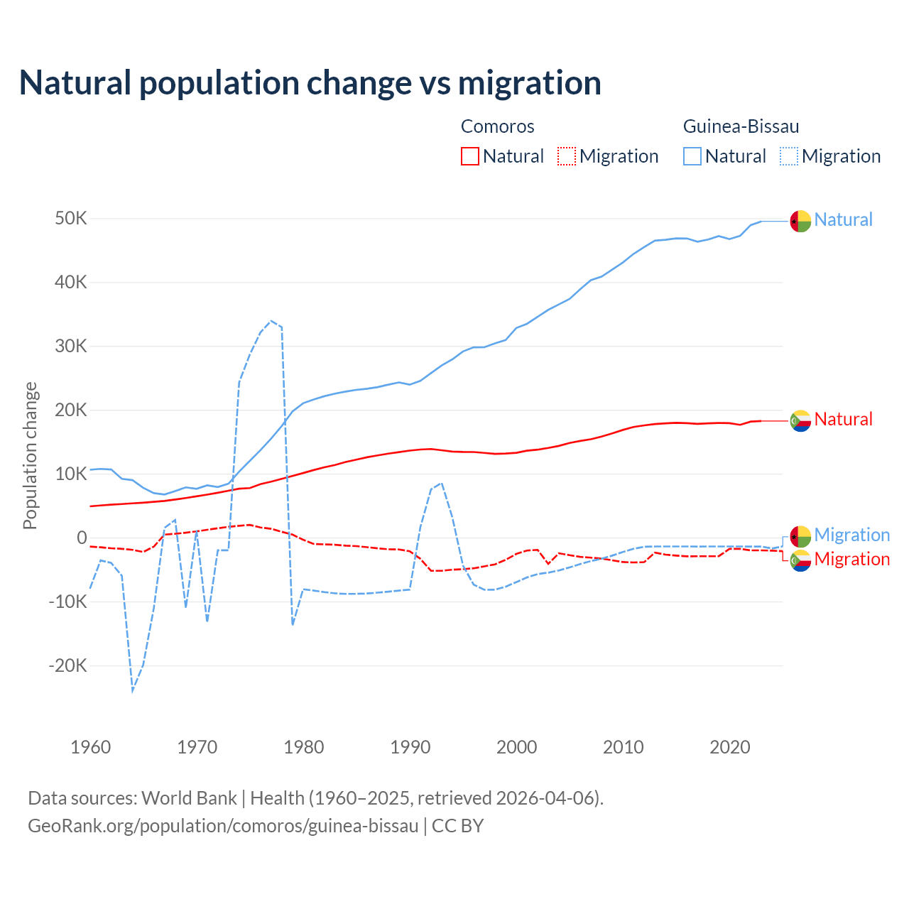 Over the last 10 years, 87.9% of the population change in Comoros is from natural causes (a gain of 179,319 people) and 12.1% is from migration (a loss of 24,709 people). In Guinea-Bissau 97.1% is from natural causes (a gain of 472,826 people) and 2.87% is from migration (a loss of 13,956 people).