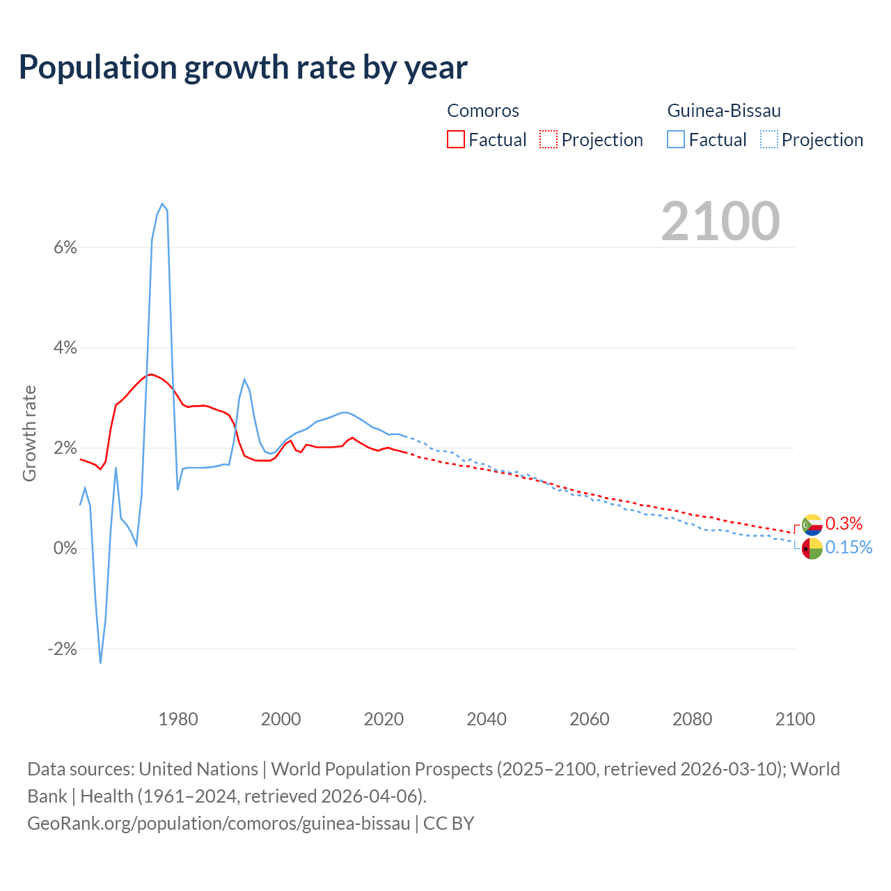 - For the last 10 years, Comoros has had an average growth rate of +2.01% per year vs +2.4% in Guinea-Bissau.