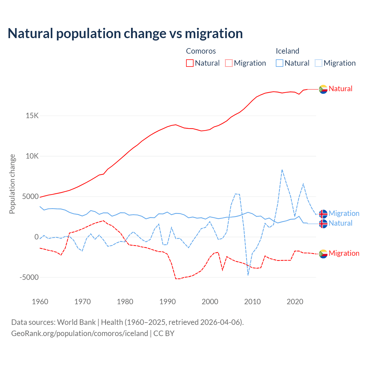 Over the last 10 years, 87.9% of the population change in Comoros is from natural causes (a gain of 179,319 people) and 12.1% is from migration (a loss of 24,709 people). In Iceland 30.7% is from natural causes (a gain of 20,128 people) and 69.3% is from migration (a gain of 45,356 people).