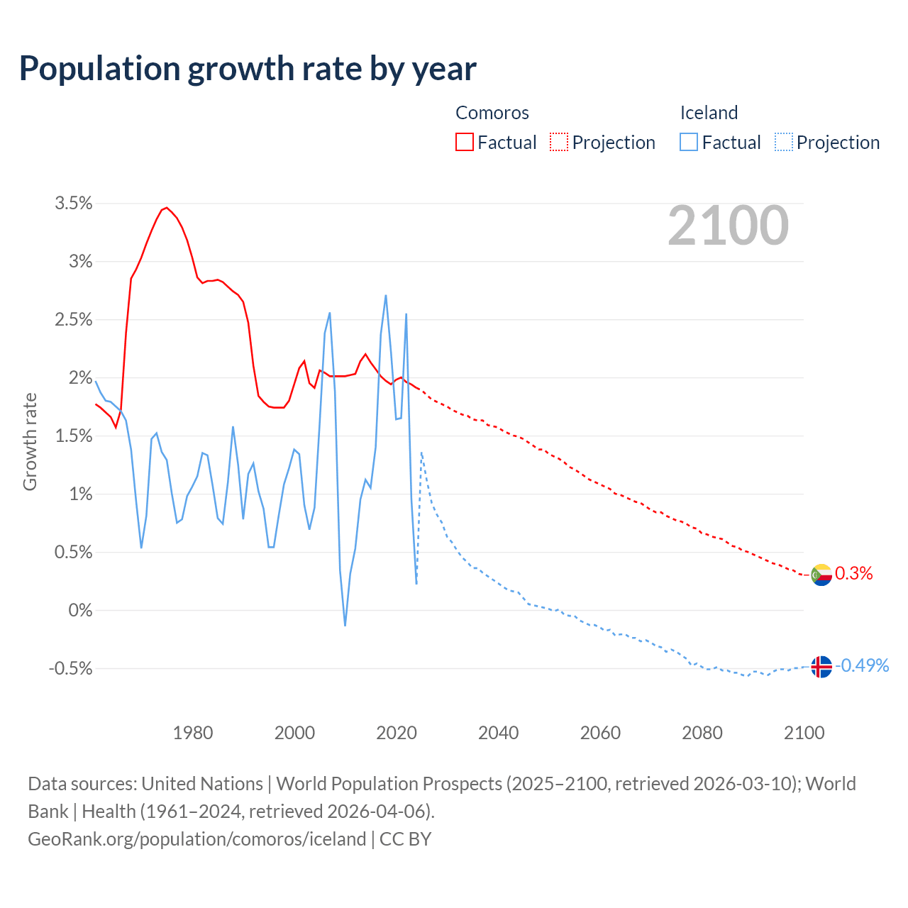 - For the last 10 years, Comoros has had an average growth rate of +2.01% per year vs +1.63% in Iceland.