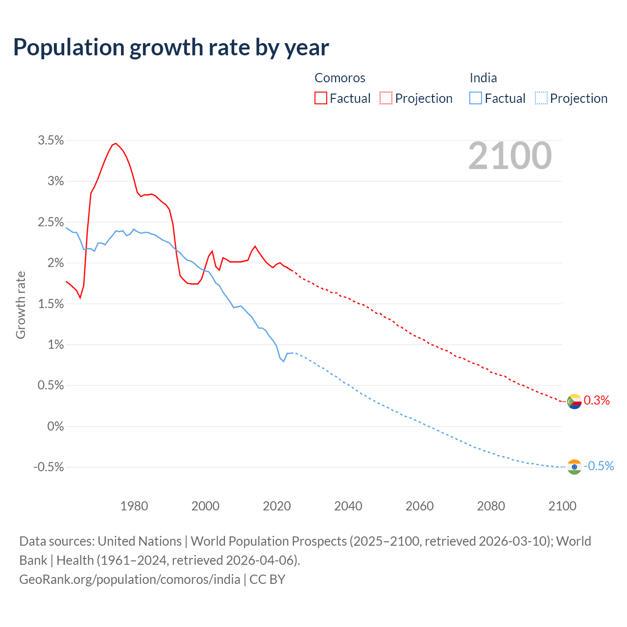 - For the last 10 years, Comoros has had an average growth rate of +2.01% per year vs +1.03% in India.