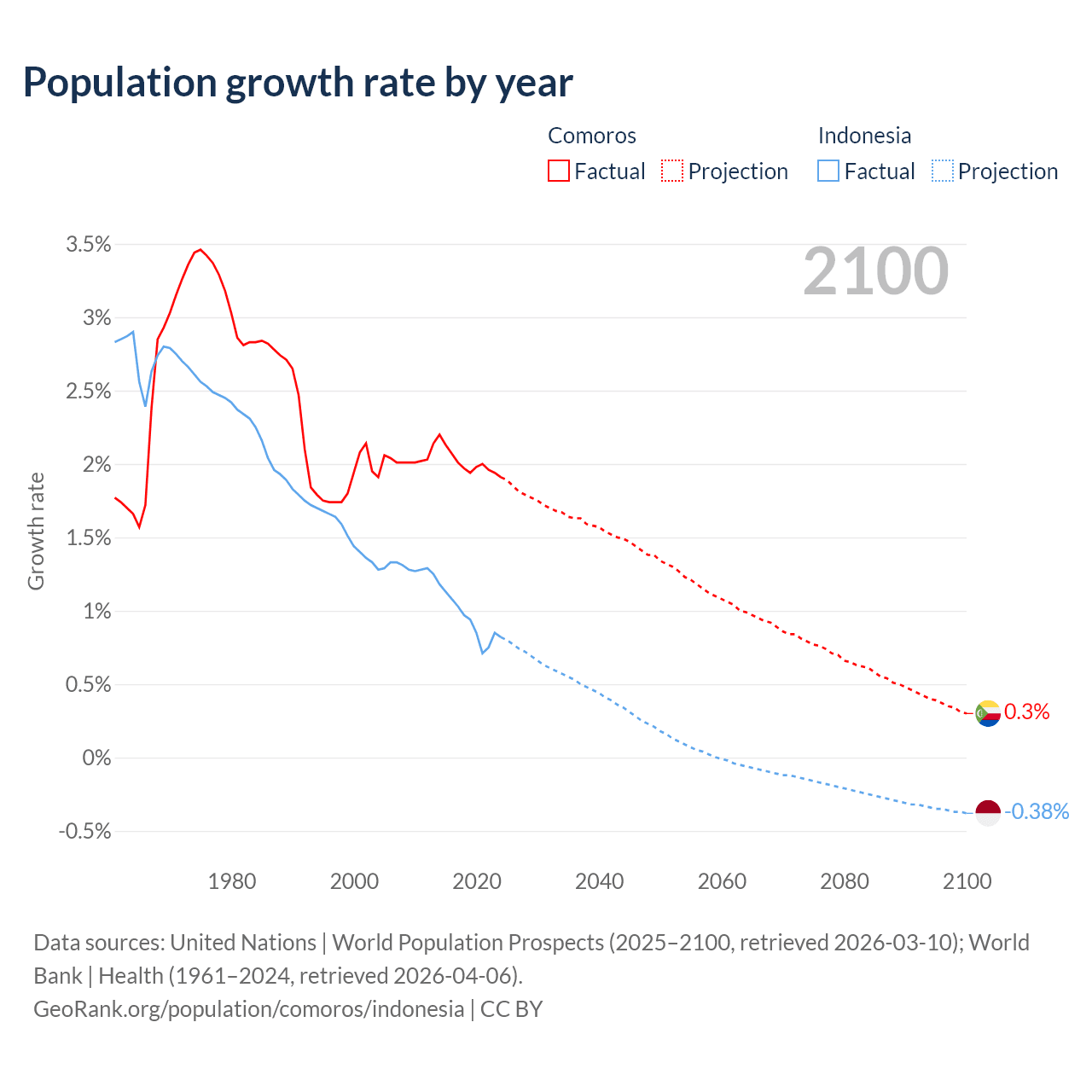 - For the last 10 years, Comoros has had an average growth rate of +2.01% per year vs +0.94% in Indonesia.