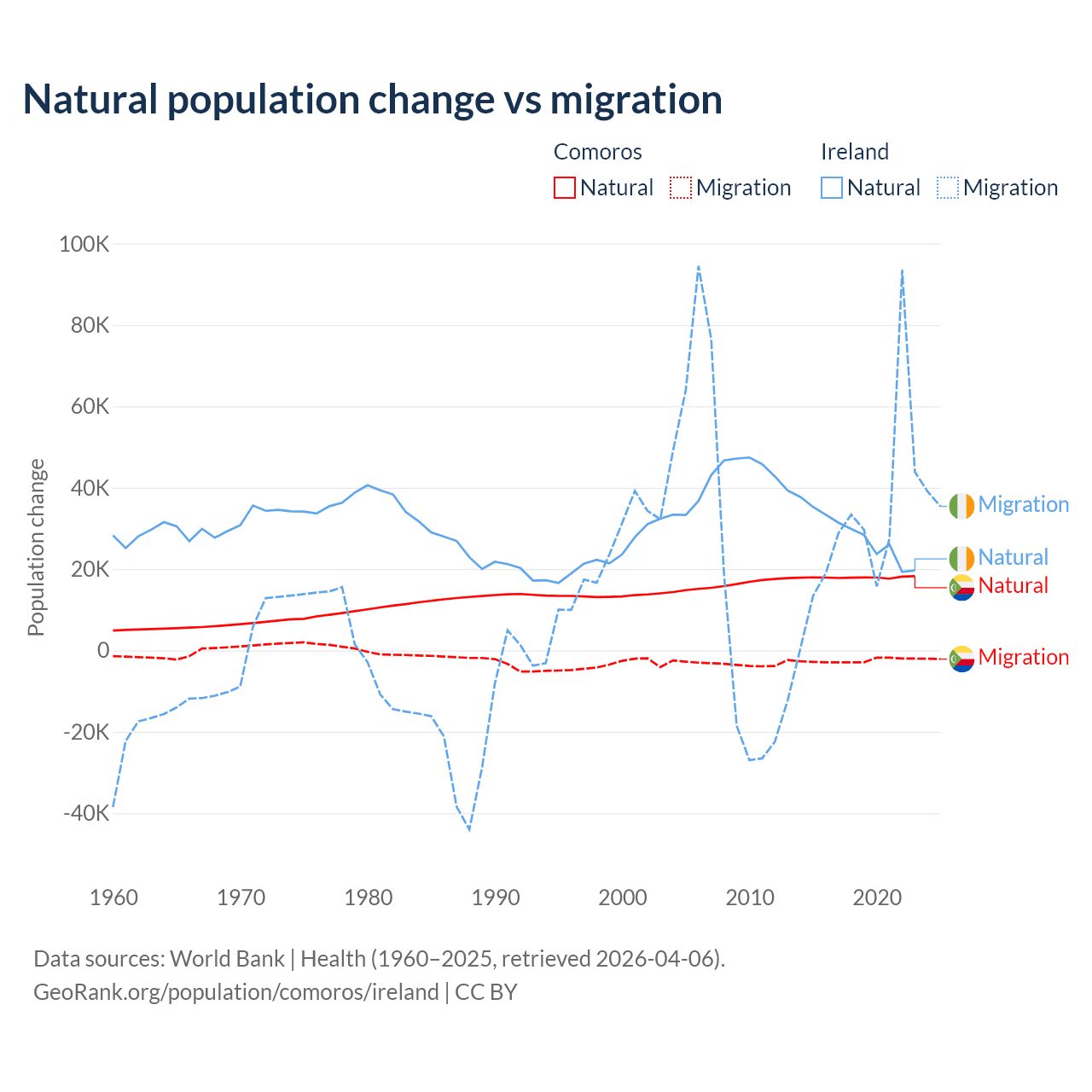 Over the last 10 years, 87.9% of the population change in Comoros is from natural causes (a gain of 179,319 people) and 12.1% is from migration (a loss of 24,709 people). In Ireland 48.2% is from natural causes (a gain of 284,644 people) and 51.8% is from migration (a gain of 305,297 people).