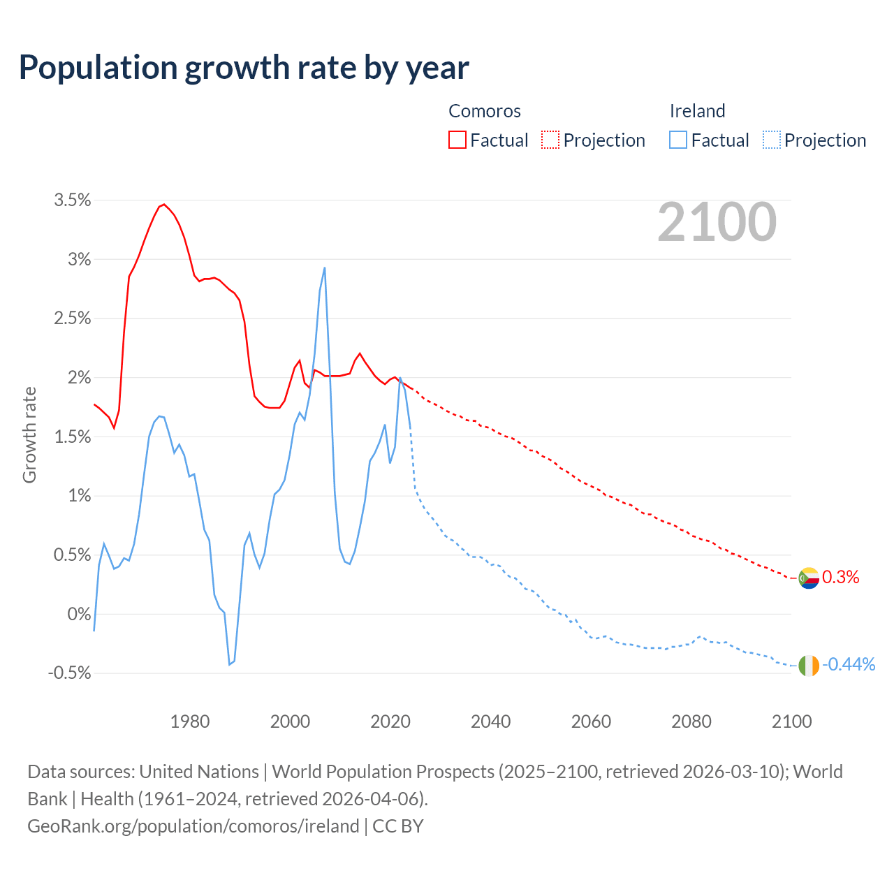 - For the last 10 years, Comoros has had an average growth rate of +2.01% per year vs +1.41% in Ireland.