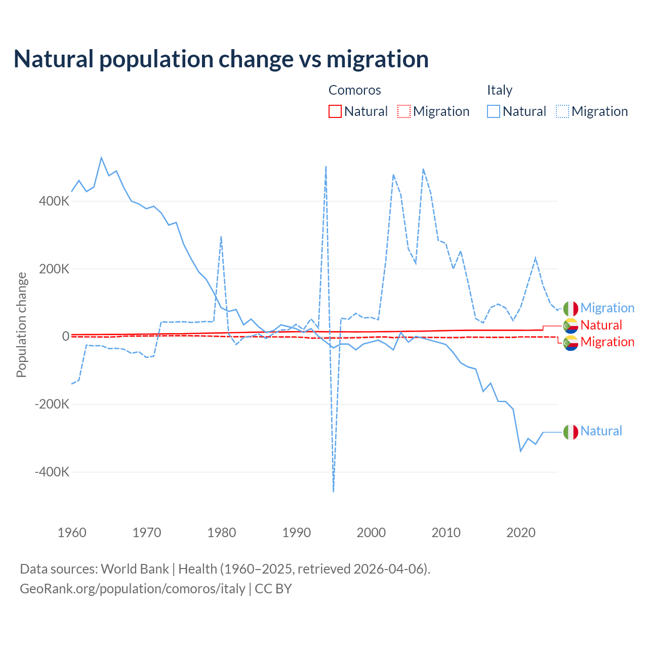 Over the last 10 years, 87.9% of the population change in Comoros is from natural causes (a gain of 179,319 people) and 12.1% is from migration (a loss of 24,709 people). In Italy 68.6% is from natural causes (a loss of 2,239,084 people) and 31.4% is from migration (a gain of 1,026,128 people).