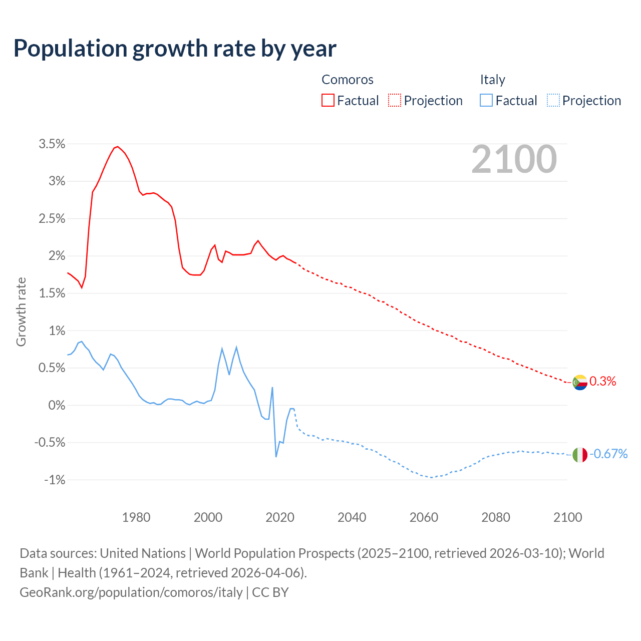 - For the last 10 years, Comoros has had an average growth rate of +2.01% per year vs -0.21% in Italy.