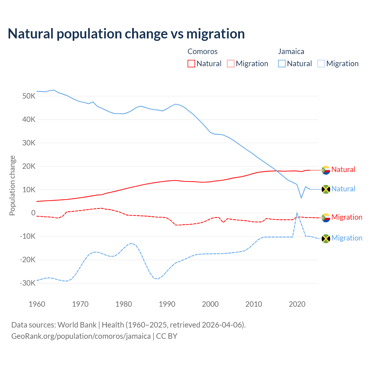 Over the last 10 years, 87.9% of the population change in Comoros is from natural causes (a gain of 179,319 people) and 12.1% is from migration (a loss of 24,709 people). In Jamaica 61.3% is from natural causes (a gain of 137,465 people) and 38.7% is from migration (a loss of 86,681 people).