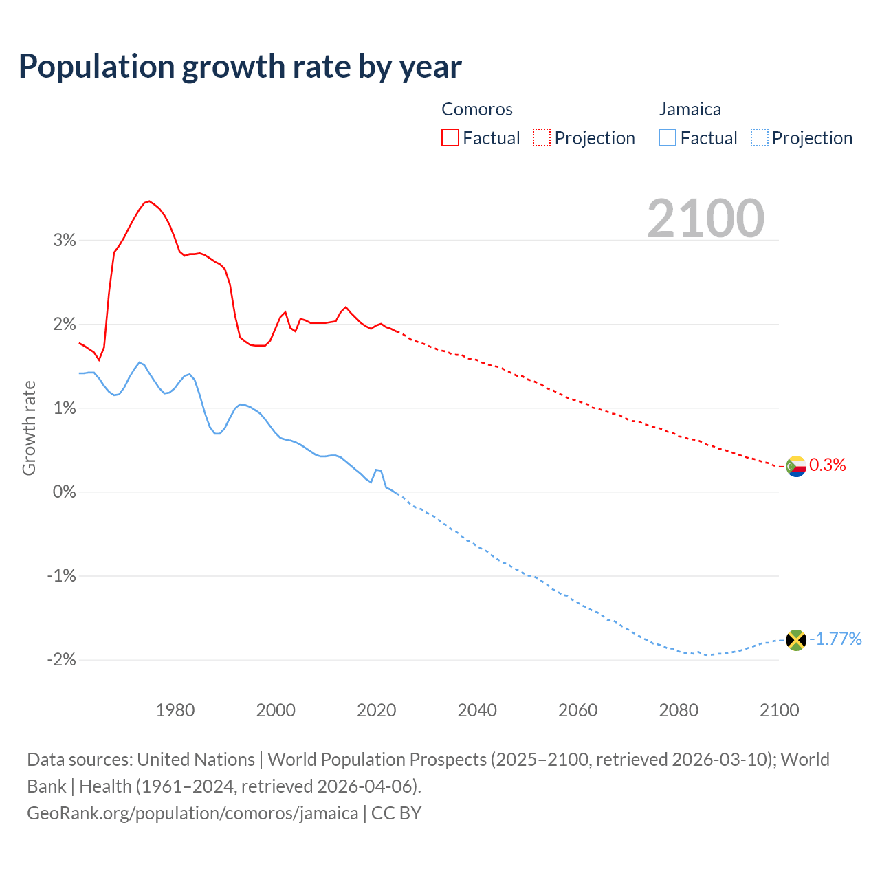 - For the last 10 years, Comoros has had an average growth rate of +2.01% per year vs +0.18% in Jamaica.