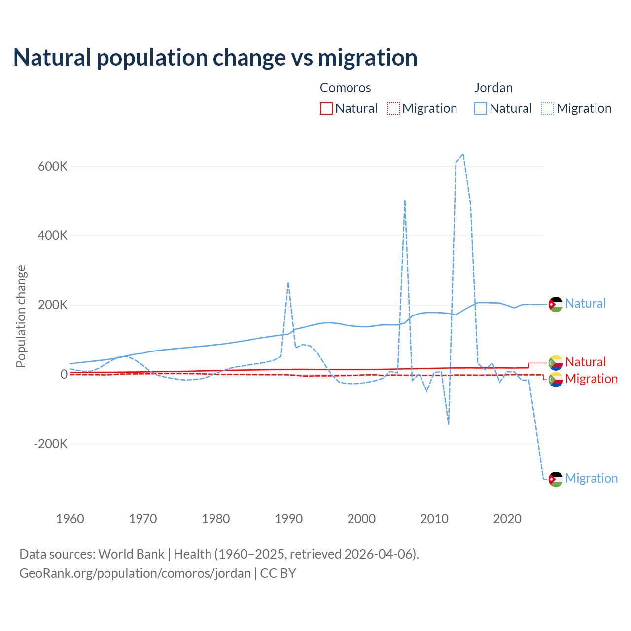 Over the last 10 years, 87.9% of the population change in Comoros is from natural causes (a gain of 179,319 people) and 12.1% is from migration (a loss of 24,709 people). In Jordan 63.2% is from natural causes (a gain of 1,991,452 people) and 36.8% is from migration (a gain of 1,157,625 people).